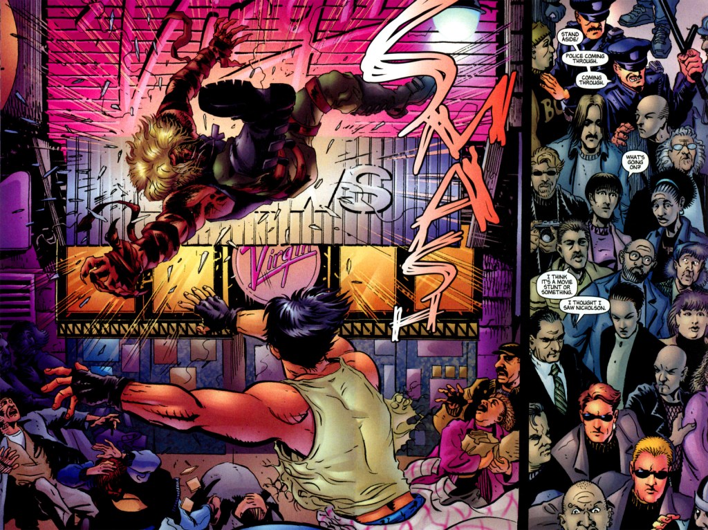 Up until this point, I did not really mind the art. But now, the artwork is quite distracting me from enjoying this issue. When you have books like Ultimate X-Men and Ultimate Spider-Man that already came out prior to this issue, and they look so much better; this book shouldn’t even have gotten released. I get it that this book was released in the early 2000s but the art style looks almost a decade prior. While I am hitting areas that need improvement, I might as well add in the writing too. There is a lot of reading! It’s okay dialogue but some of the pages are super heavy with narration. Bendis just adds a bit too much, and if he took some of it away, it would not have changed the story one bit.