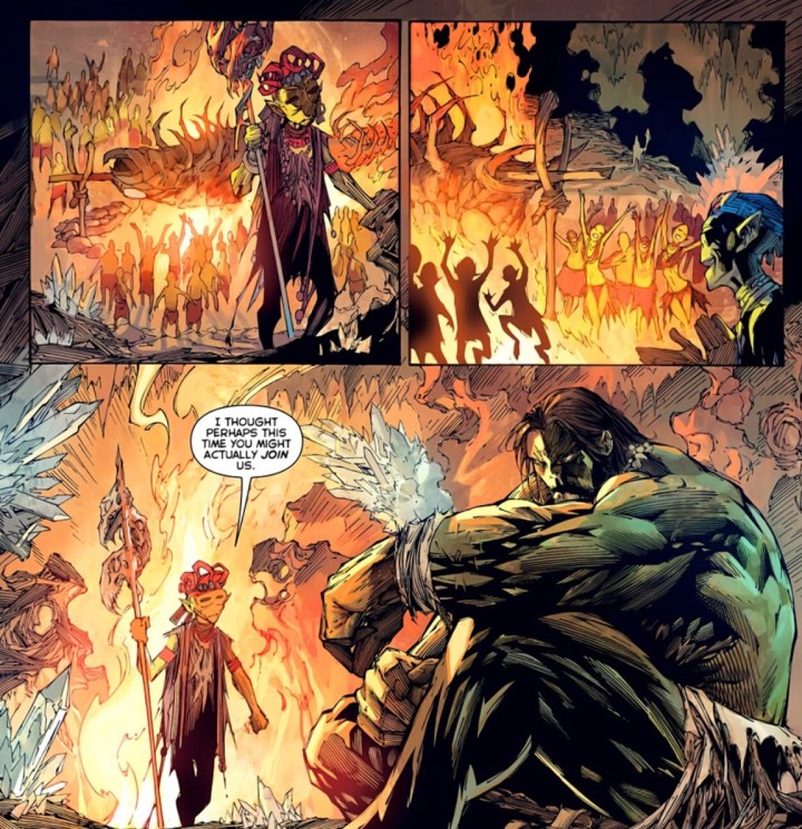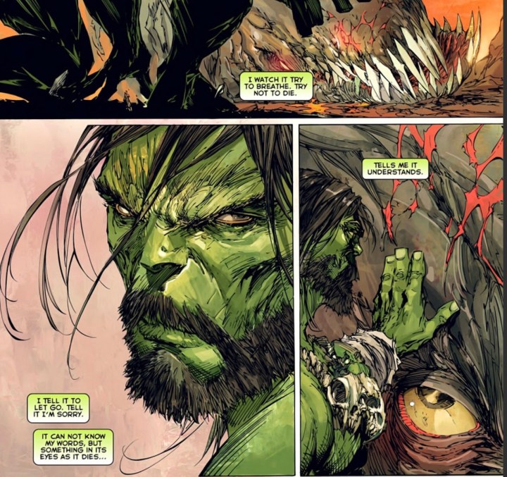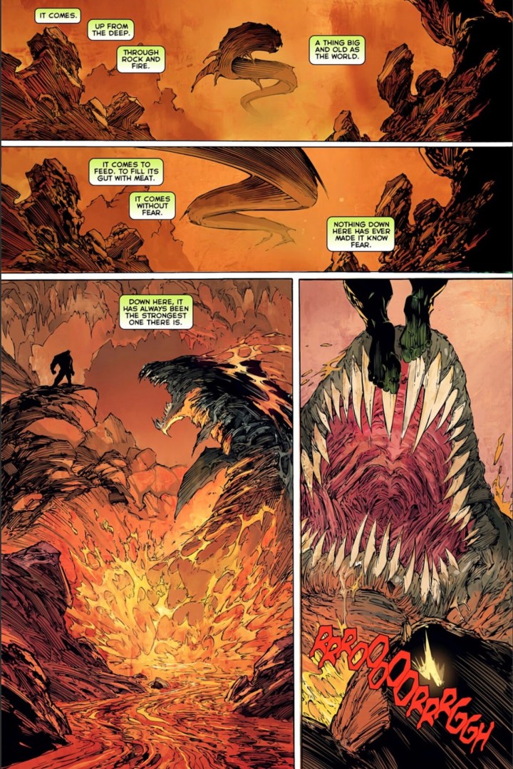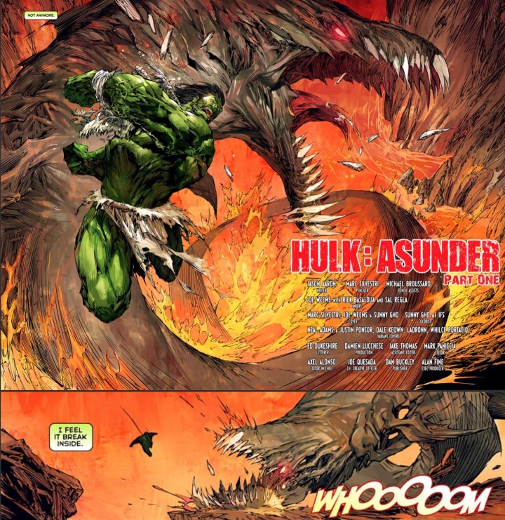 Readers, leave it to Jason Aaron to take something so familiar about the Incredible Hulk but add a few twists to make it his own. Sure, Hulk has battled monsters, villains, heroes, and entire worlds before but not at the Earth’s core. Furthermore, he’s also tried to hide and be left alone… but not at the Earth’s core. Basically, this issue begins like your classic Hulk story. However, Aaron is a master of taking the typical, updating it, and pulling readers into his story rather quickly. This reader was locked in after the opening three pages. And other than a minor issue towards the end, I was immensely captivated by this inaugural issue. Plus, I didn’t realize how fast the issue was cruising along until it was over, which made for an easy read and a perfect jumping-on point for any new reader interested in dipping their toe into a Hulk story.