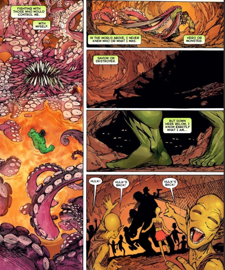 This story begins like many other Hulk tales; tragic, alone, angry, and absent from happiness… until Hulk eventually gives in and finds some sort of satisfaction. It’s a familiar tale. You know the one where the most WANTED or hated man finds a way to hide from the people that want him dead. Well, Hulk managed to do that in the Center of the Earth with a tribe of Moloids. (I didn’t see that one coming..) Let’s smash into this inaugural issue of INCREDIBLE HULK #1 (2011) by Jason Aaron to see what our Big Green Goliath is doing in the Center of the Earth.