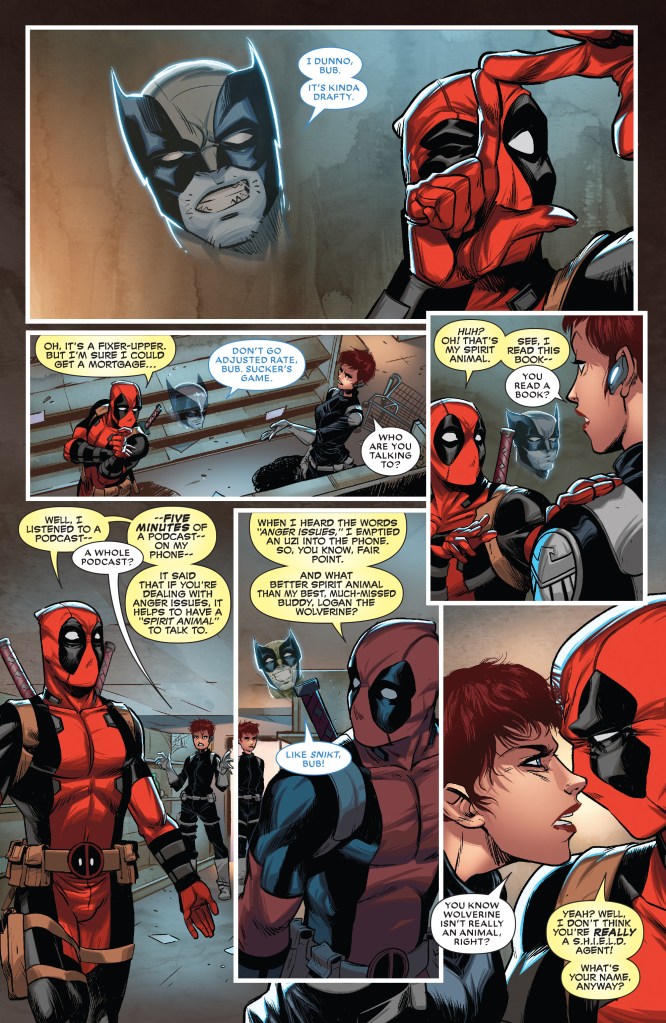 Our story begins with our friendly neighborhood Deadpool and a S.H.I.E.L.D. agent, Agent Mary where we get introduced to Deadpool’s spirit animal, Wolverine. Like legit the mutant Wolverine, not an animal but Logan. They are in a Safe House where Deadpool is waiting for his targer, but who might that be? Stuart Moore shows right away that he knows Deadpool and the beginning is funny and looks gorgeous!