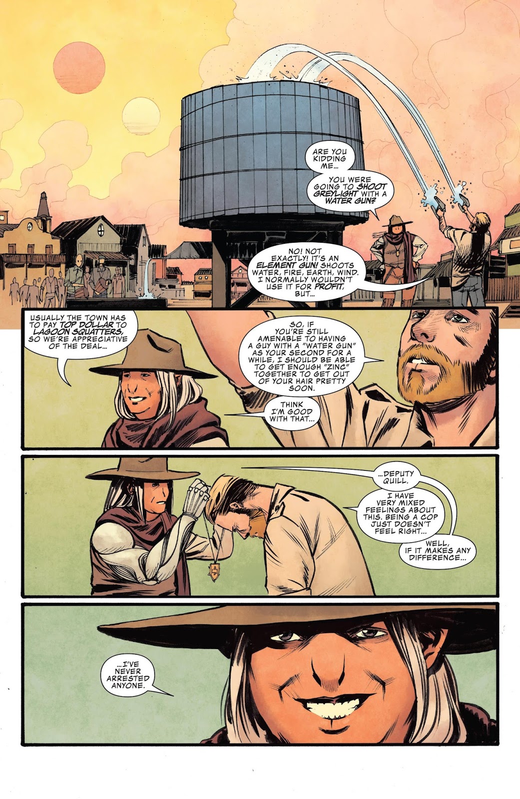 He does, but Greylight knows exactly who he is (Peter’s dream, right?) and proceeds to knock him out with ease. After waking up (again!), Peter becomes the town’s deputy, gives them water with his element gun and finds out he probably will be on this backwoods planet for a while. It’s then off to do some police work, but it’s over quick as Peter thinks he recognizes a man named “Squeaks”, but they are called back to town.