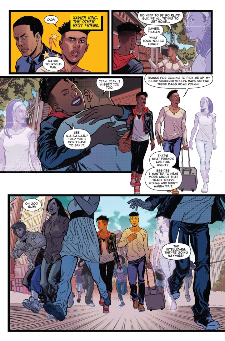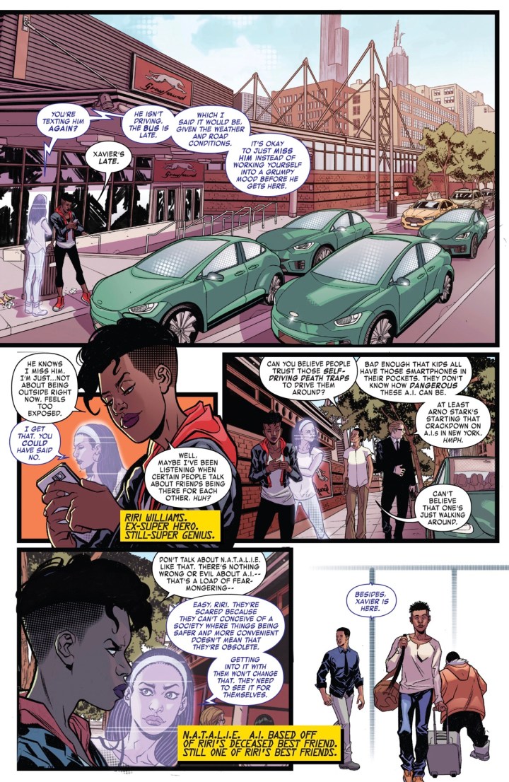 Plus, this issue isn’t new reader friendly at all. Other than mini introductions to the characters, new readers hopping onboard and searching for a new title during this comic hiatus will probably leave confused especially with the emotional change from Riri’s A.I. named N.A.T.A.L.I.E. who’s willing to defend hate mongers at the beginning of the issue yet is eager to instantly attack the so-called “villain” before getting the facts later in the story related to that very same hatred. Furthermore, if the writing wasn’t enough to turn you away, David Messina’s artistic license didn’t lend itself well to this issue either. His style wasn’t terrible but there were a few panels where the characters looked weird, like the child on page five and the very last cliffhanger page of the issue. To put it kindly, I feel like I’ve seen better work from Messina especially if you’ve read any of his STAR TREK work.