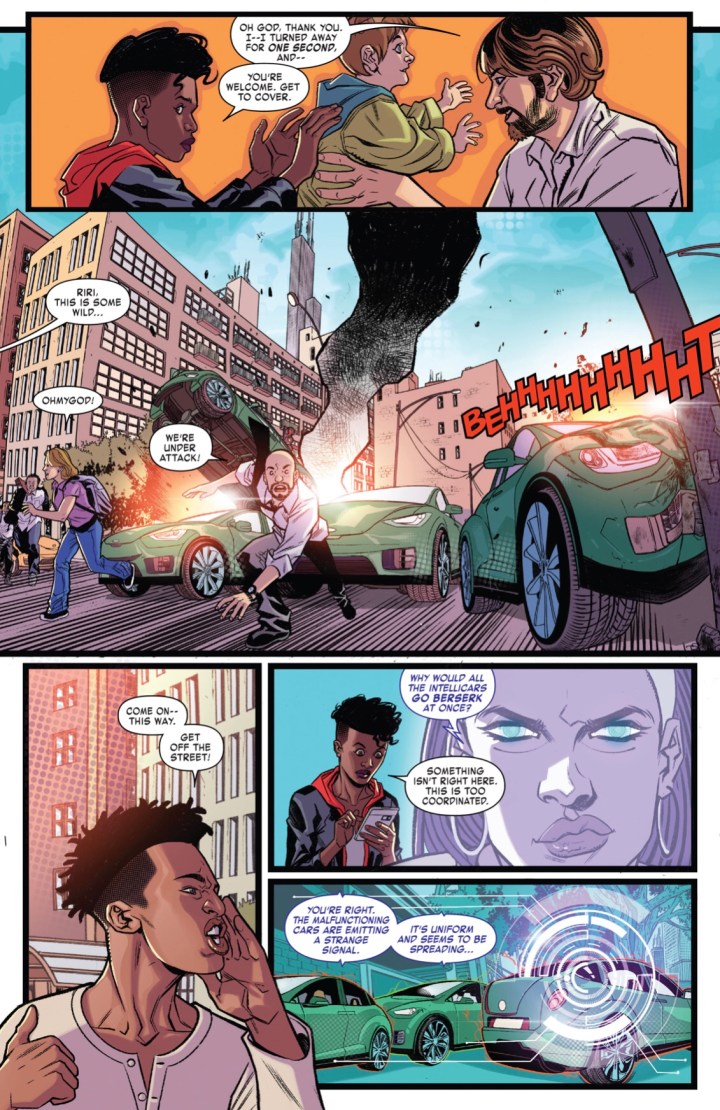 Well, to anyone following the IRON MAN 2020 event to date, you’d see that most of the side issues are filler and really don’t promote the overall plot of the story at all. Actually, there is very little connection between them and the main IRON MAN 2020 title so much so that I’m not even sure if they’re talking with Dan Slott about what’s in the books or what should be in the books with any purpose or direction. So, guess what? IRONHEART 2020 #1 is no different and with the distribution style changing to digital-only, this reviewer could see the writing on the wall before opening the pages. However, that’s genuinely not the biggest problem with the issue.
