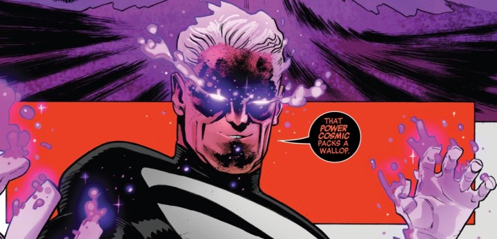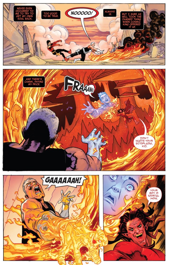 Let’s rewind, shall we? Hallum created a new villain named Cosmic King and ultimately gave no real reason for Frank to square off against him in order for Frank to regain his soul while using this entire series as a summary of the Cosmic Ghost Riders’ backstory. In other words, this series has been a slide show of the Cosmic Ghost Riders’ short history sprinkled between a fight with a self-created villain who shares the same name as a DC Comics character. Nevertheless, this still doesn’t include the surprise demonic tapeworm that was thrust into the series for no real reason other than to create a backstory for the made-up villain. Does all this sound about right?