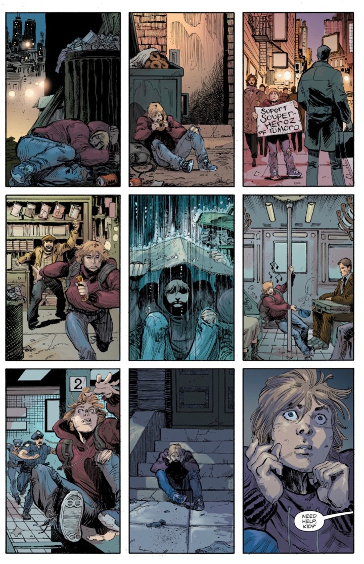 Speaking of Spider-Man’s cast, the addition of Punisher and Sandman mixing it up in this issue doesn’t hurt the thematic of Scream one bit. In fact, their motivations actually come around to the main plot of the book. That main plot being the disappearance of homeless children. Andi doesn’t initially factor in on this at first, merely showing up to deal with both Frank Castle and Flint Marko (or is he going by William Baker again?), until she finds out from Detective Henley that youths have been vanishing.
