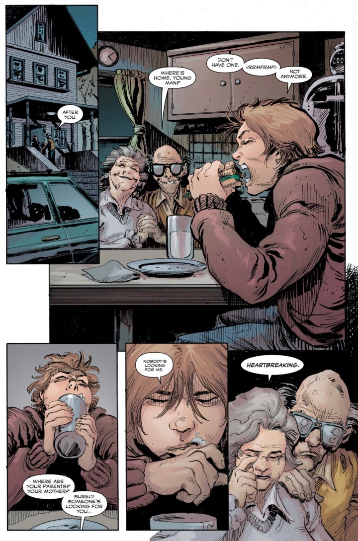 Its nice to know the genre I’ve come to expect and appreciate this book for hasn’t changed. The standard Sandoval cover might suggest standard superhero affairs are to be expected, but Chapman and Mooneyham are still delivering a dark, grimy story that infuses superheroics with the paranormal, street-level thriller, and is that a touch of detective noir I’m picking up in the recipe? Both Chapman and Mooneyham combine their talents to present us with the moody atmosphere I’ve praised this book for carrying, feeling less like your typical mainstream tights-n-capes comic and more inline with a dark indie book. It’s amazing to think that this book shares continuity with the bigger Marvel Universe when it also feels like it’s taking shape within its own private corner. I’m still shocked to see Spider-Man’s Aunt May being borrowed for this title, and that she never feels out of place, as she continues her good-natured relationship with the homeless of New York, like Andi, through her work at the FEAST Center.