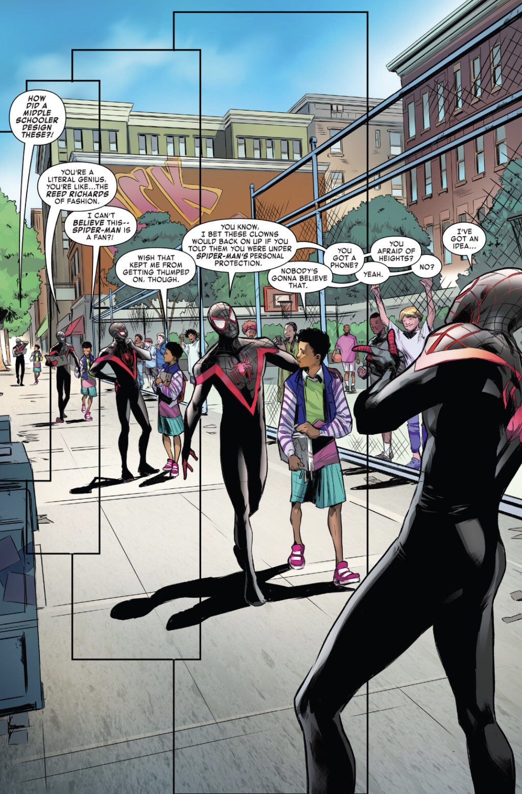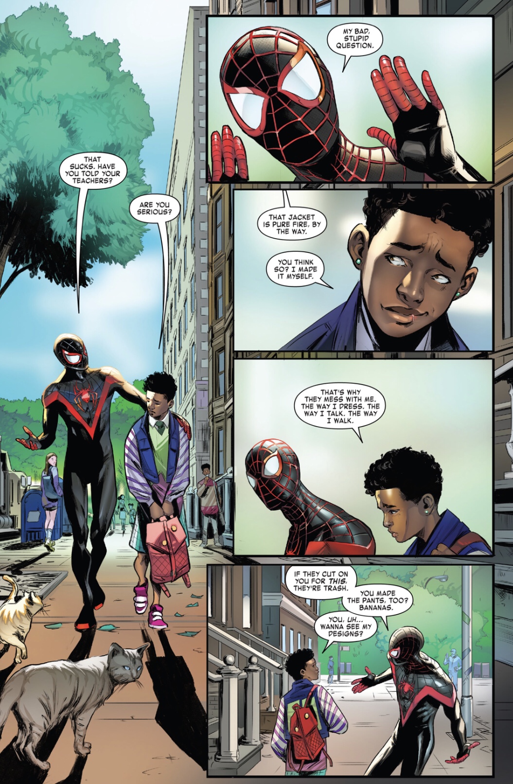 While we get a mention of the Outlawed Event on the first page, I’m not going to let that get me down. Some of my favorite recent issues of Spider-Man have been one-shots where we get to see Spidey just being a nice guy. Peter recently got one in Spectacular that may or may not (it did!) made me cry with Spiderbite, and Miles gets his turn this month. He helps a middle-schooler, Kenneth, who is bullied just for being himself. Miles records a “you mess with Kenneth, you mess with me,” PSA and heads off. I feel that Kenneth will be designing some new Spider-duds soon, and I am all for it!