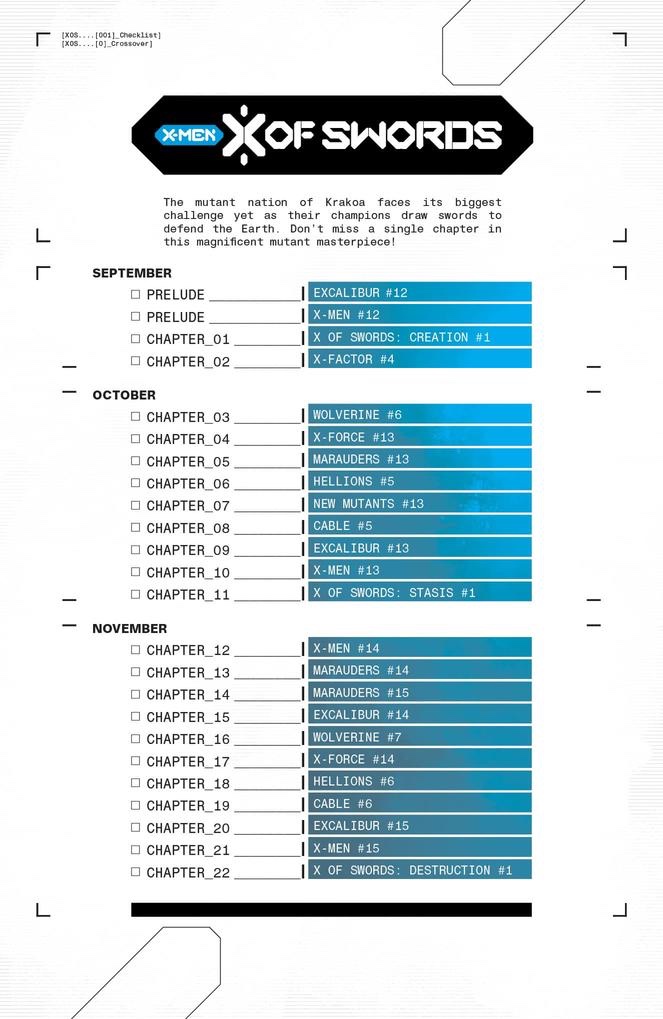 Holy Rusted Metal X-fans, the new X-Event scheduled to drop this September called X OF SWORDS has now increased from a mere 15 parts to now a whopping 24 issues! Marvel has deemed this event as a throwback to their classic style encompassing all of the current X-titles. Below is a sneak peek at a checklist to wet your whistle and energize the passionate masses.
