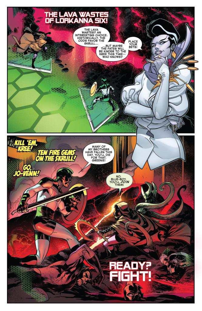 It starts, “the introduction of a long-hidden Elder of the Universe… the Profiteer! Witness the first appearance of this new, major player in the cosmos!” Those are Marvel’s official words, not mine. She is running the Casino Cosmico, where the Kree/Skrull War continues with staged battles for fun and profit…mainly hers! There are also standard casino games of chance and skill, but now, the focus is on the fighting. We get to see a fight that plays out a past battle in the Lava Wastes of Lorkanna Six, which is fun, but the whole intro scene does go on a bit too long.