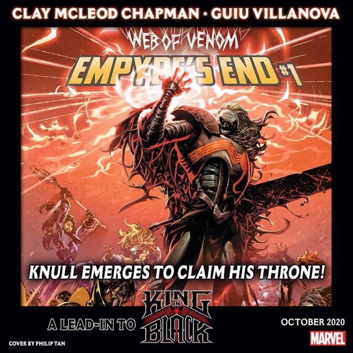 This Fall, Marvel explodes with a new series that will usher in the KING IN BLACK coming December 2020. Above is your first look at WEB OF VENOM: EMPYRE’S END #1 arriving this October 2020 from Clay McLeod Chapman, Guiu Villanova, and cover by Phillip Tan. Take a look at this teaser and get pumped for this series, as well as the KING IN BLACK and X OF SWORDS all rolling in this Fall 2020! From now thru the New Year, Marvel is set up with some explosive events, series, and tie-ins that should keep Marvel Comic fans on their toes. If you don’t believe me, click the links to articles below to up and coming events happening RIGHT NOW and continuing until the New Year.