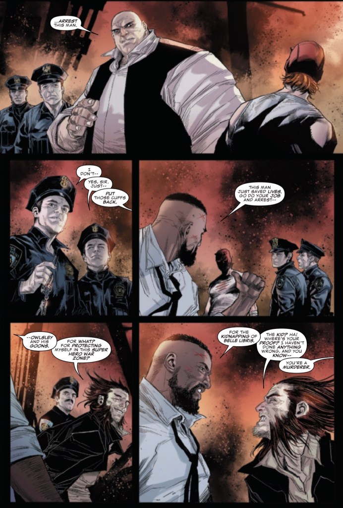 Daredevil #21 opens with the start of the Hells Kitchen cleanup. Villains are being led away in cuffs, and everyone is trying to figure out what to do next. Of course, the last issue’s cliffhanger spelled out what Matt intends to do, and that doesn’t change here. He is turning himself in. Kingpin tries to make it a bigger deal (if that’s possible) by posturing and yelling, but it all comes down to Matt doing what’s right.