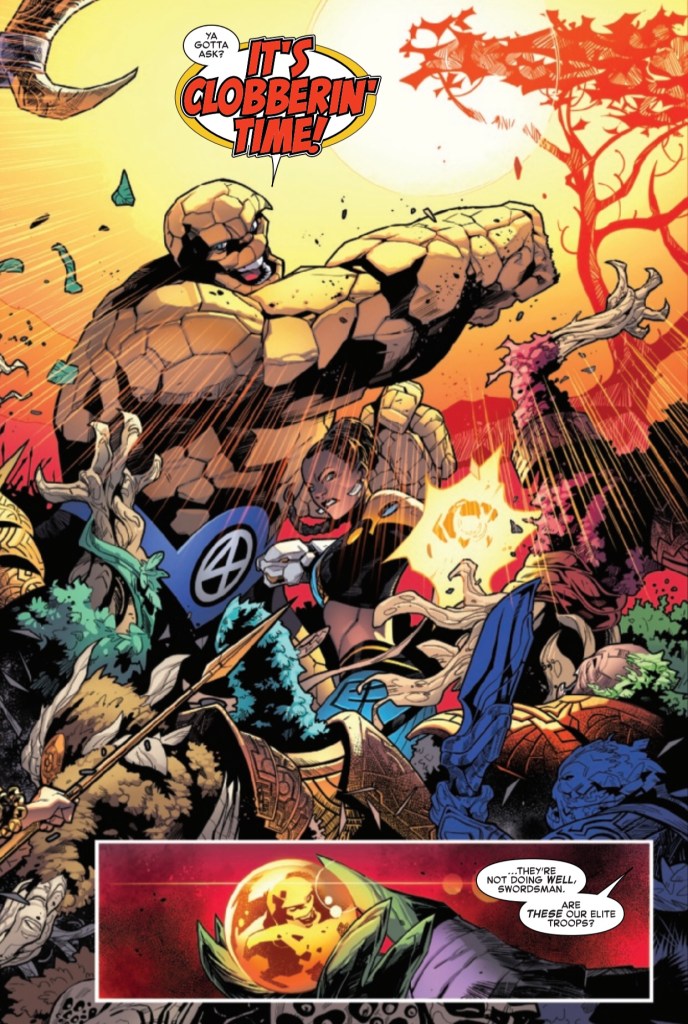 We then head to Avengers Mountain to see what the two big brains of the story, Tony and Reed are doing. Moping and sulking is the order of the day, and these two are getting seconds and thirds! After brief glimpses of what Captain America and Thor are up to, we head to Wakanda and check in with the Thing.