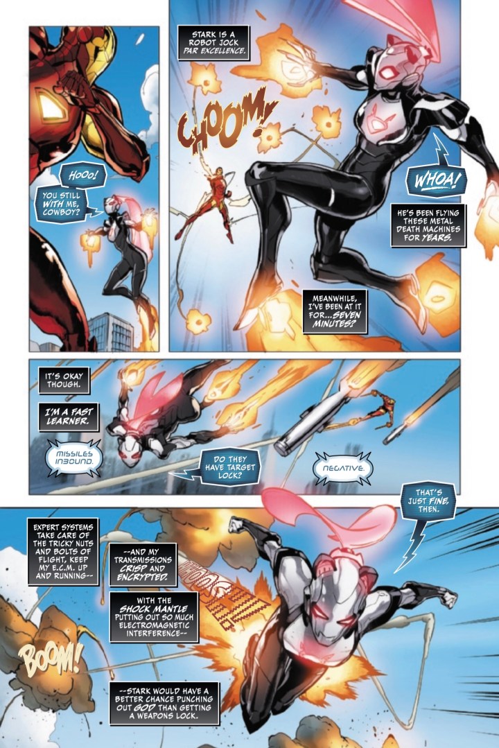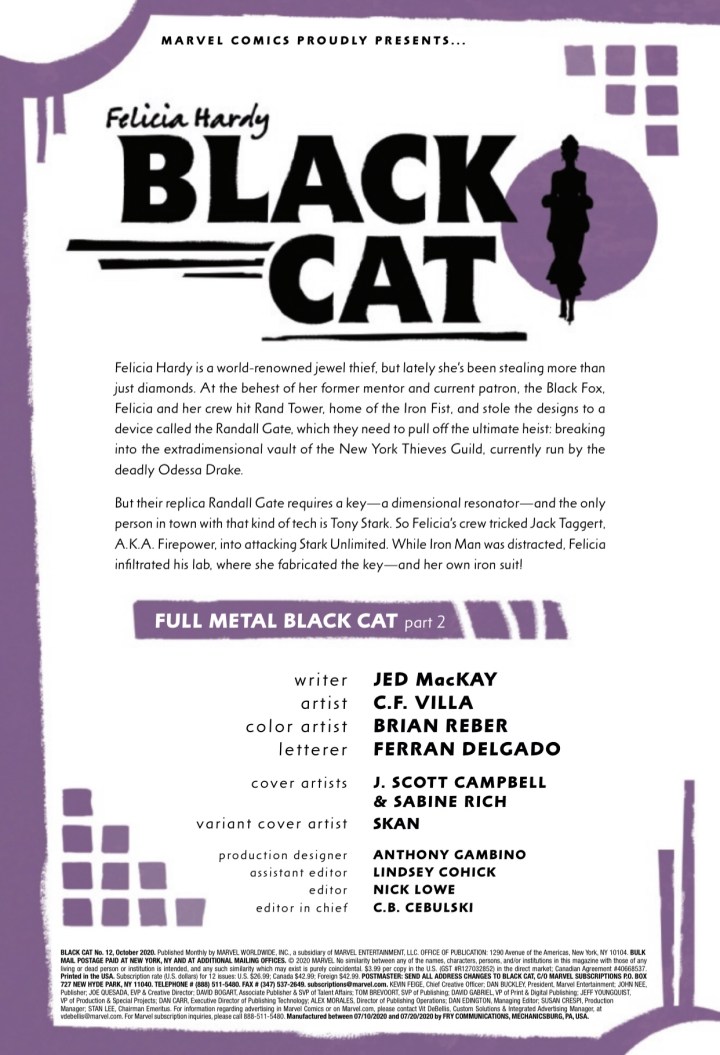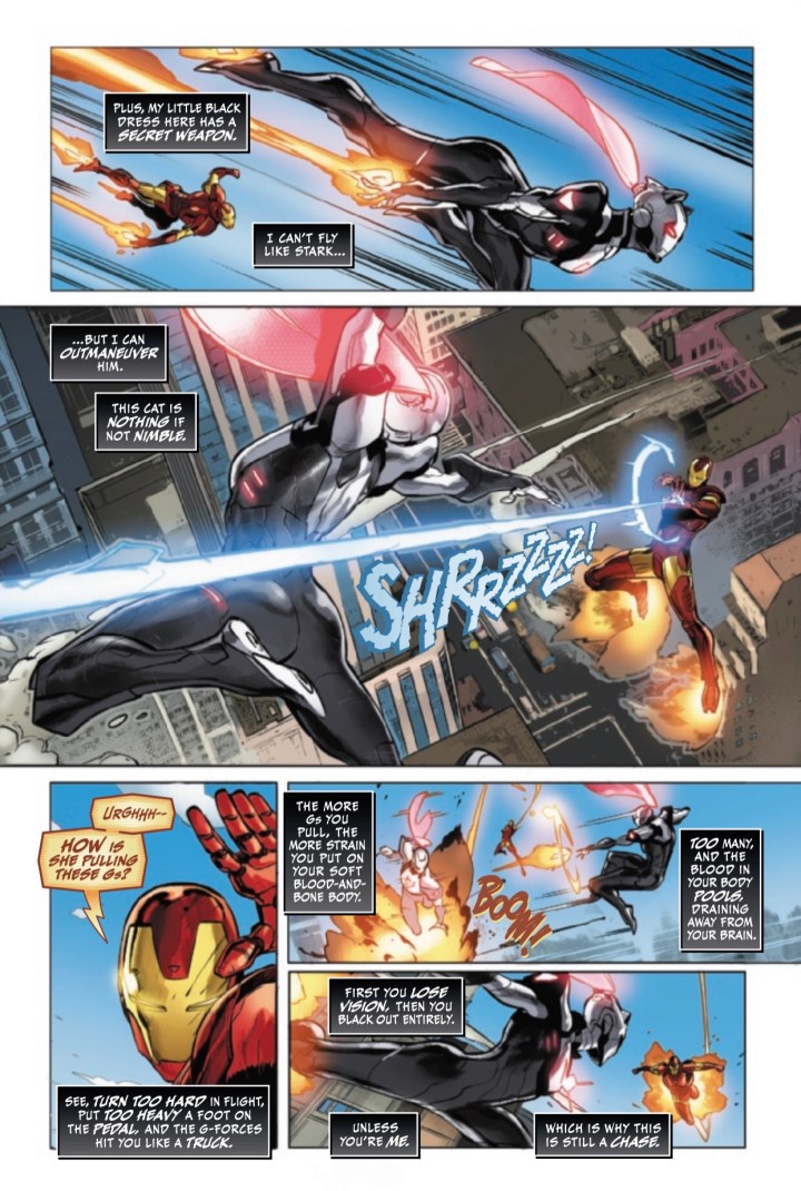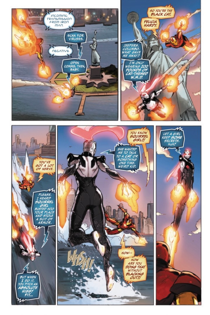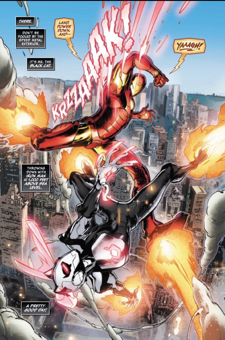 Well, she did it this time. Black Cat stole an Iron Man armor from Iron Man, and he is NOT pleased. So she is on the run (fly, really) from Iron Man through Manhattan but also still on the run from the Thieves Guild. So it’s tough being Felicia Hardy right now. And it’s possible the armor wasn’t what she was stealing from Iron Man. Uh-oh.
