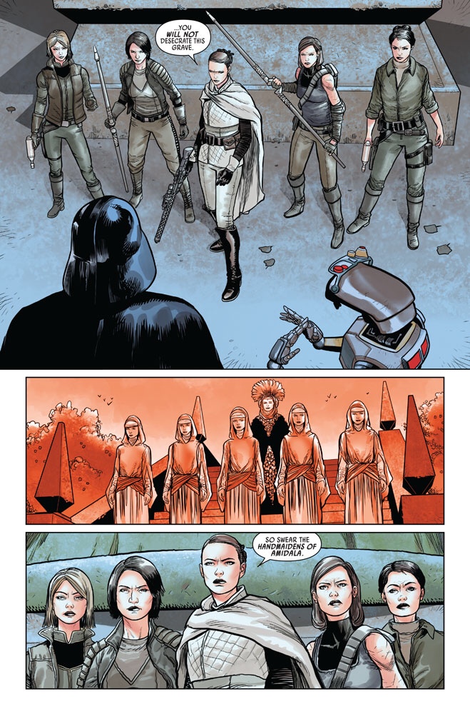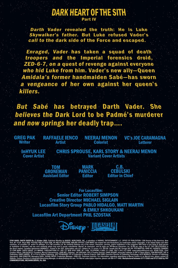 DARTH VADER continues his terrifying quest for vengeance against everyone who hid the existence of his son from him. But on NABOO, the DARK LORD OF THE SITH faces a deadly new challenge as his focus turns from LUKE to PADMÉ, the wife of the man Vader used to be. And what secrets lie in the tomb of PADMÉ AMIDALA?