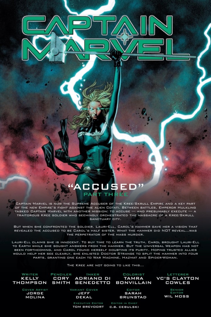 Captain Marvel recruits some of her closest allies to unravel the mystery of the Universal Weapon — and the woman she’s meant to accuse. But is Carol splitting her power just when she’ll need it most? And how is the united Kree/Skrull Empire going to react to three more HUMAN Accusers?!