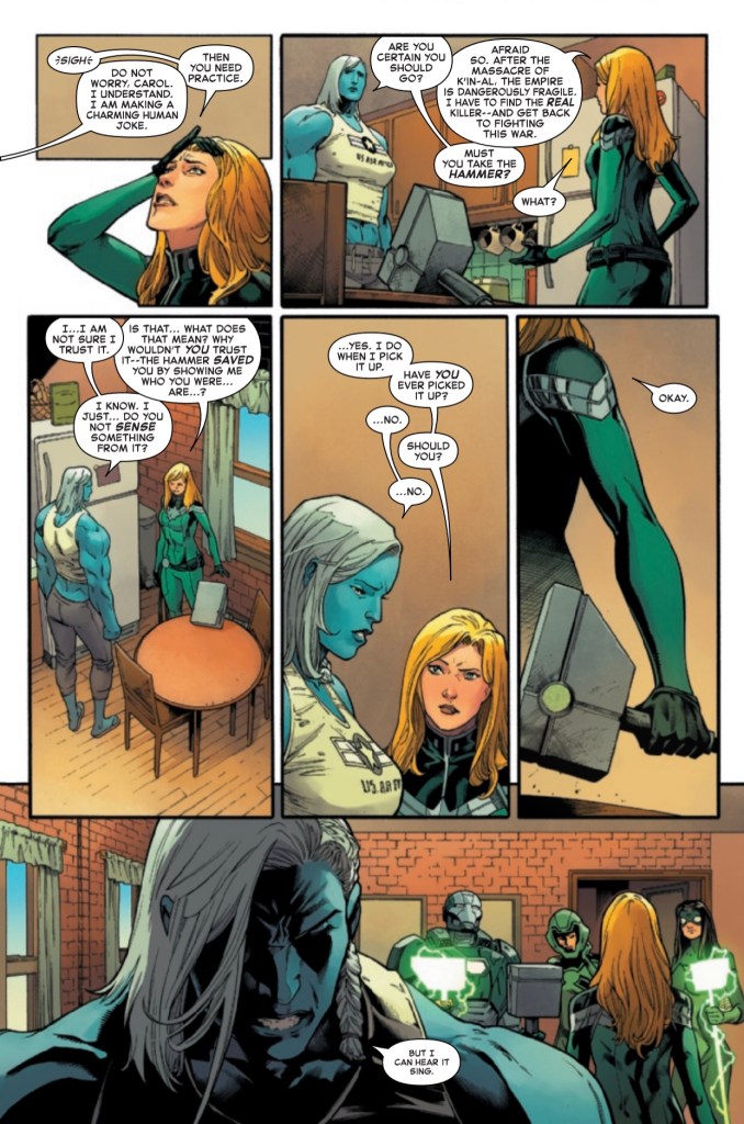 We first get the team meeting Carol’s new sister. It is a bit of a waste of time since Lauri-Ell is pretty much a shadow of a character. She likes flowers. She was made and designed to be a warrior, and she was made from Carol’s Kree mother’s DNA. That is all we know about her. Hearing the exact same information is just a waste of ink.