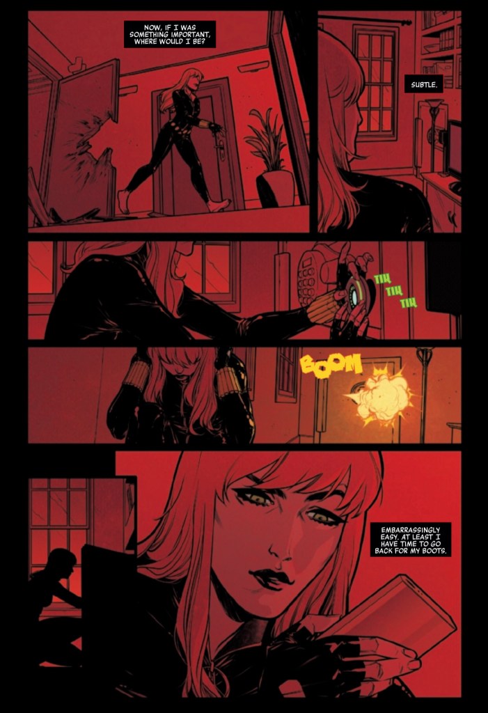 I liked this opening a whole lot. This book is coming out to coincide with the Black Widow movie, and it kicks off with a tremendous cinematic opening. It gives most fans what they want in a Black Widow book right off the bat and right before the rug gets pulled out from under us, and Natasha!