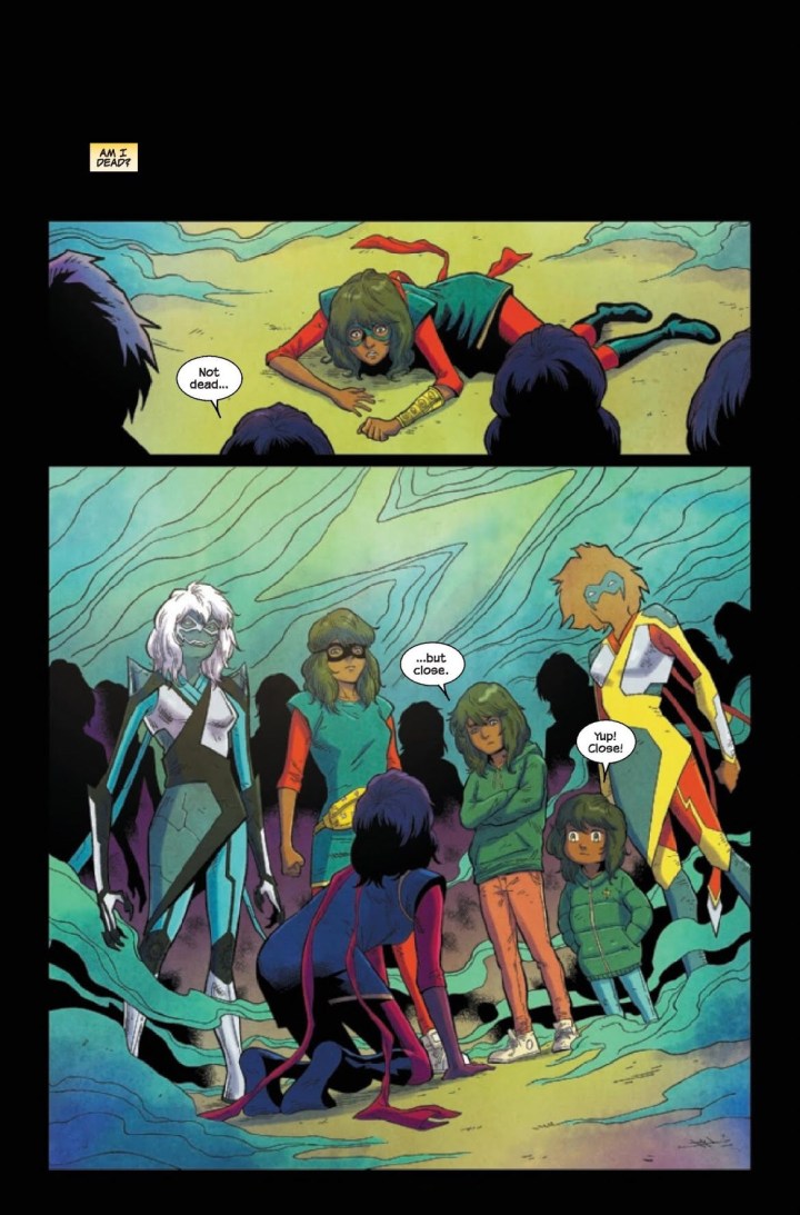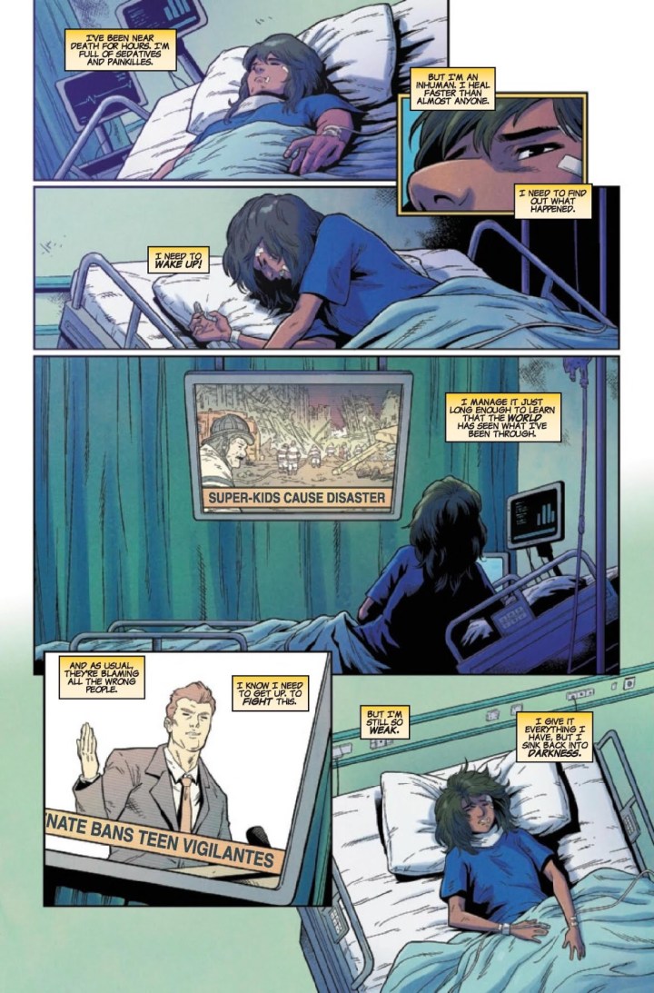 As Ms. Marvel recovers from a traumatic ordeal, she finds herself an unwilling martyr for a movement she hates. If she wants to reclaim her narrative, she’ll have to wake up first…