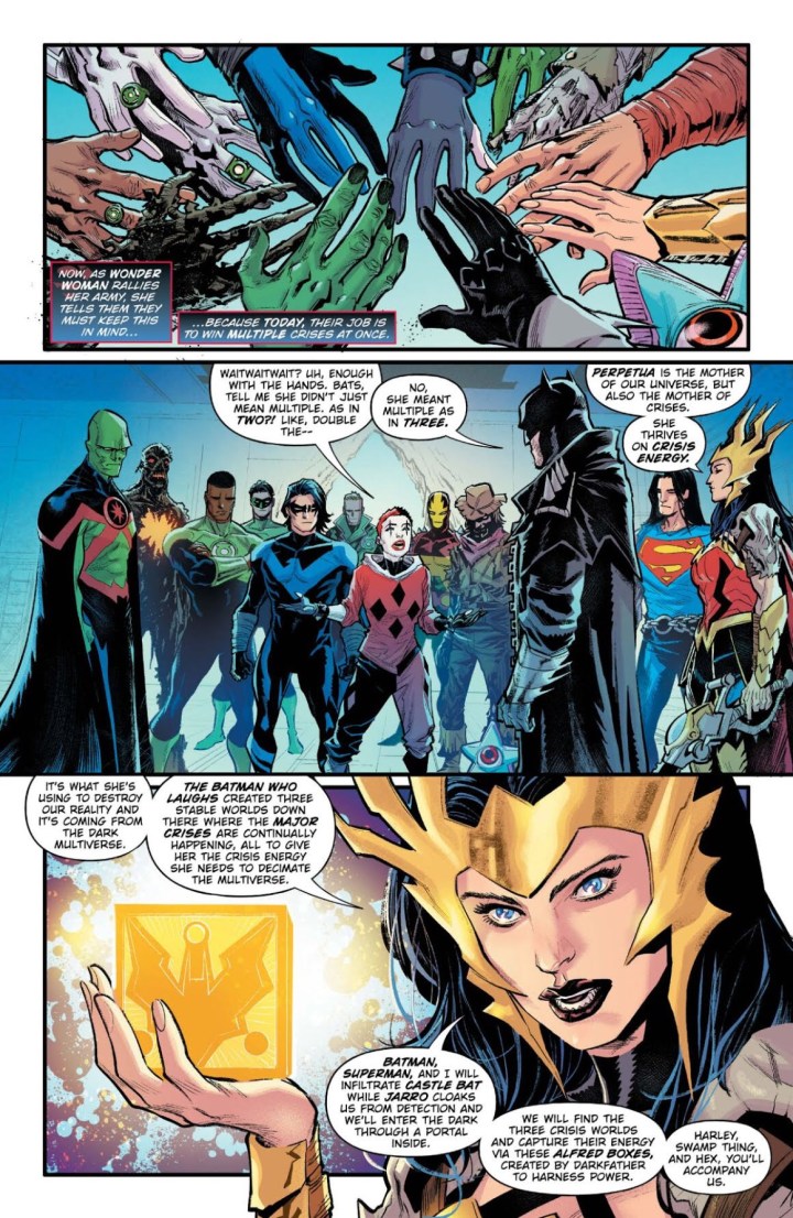 With Superman freed from his New Apokolips prison, the classic Trinity lineup is back together and ready to rock their next gig. Wonder Woman, Batman, and Superman amp up their power to launch an assault on Castle Bat, and that’s just the warm-up act! Three walking nightmares are hidden deep inside the fortress—but these Dark Multiverse versions of the Anti-Monitor, Superboy Prime, and Darkseid hold the key to humanity’s survival. The Justice League have to face down their old nemeses, but will round two be the end for our heroes?