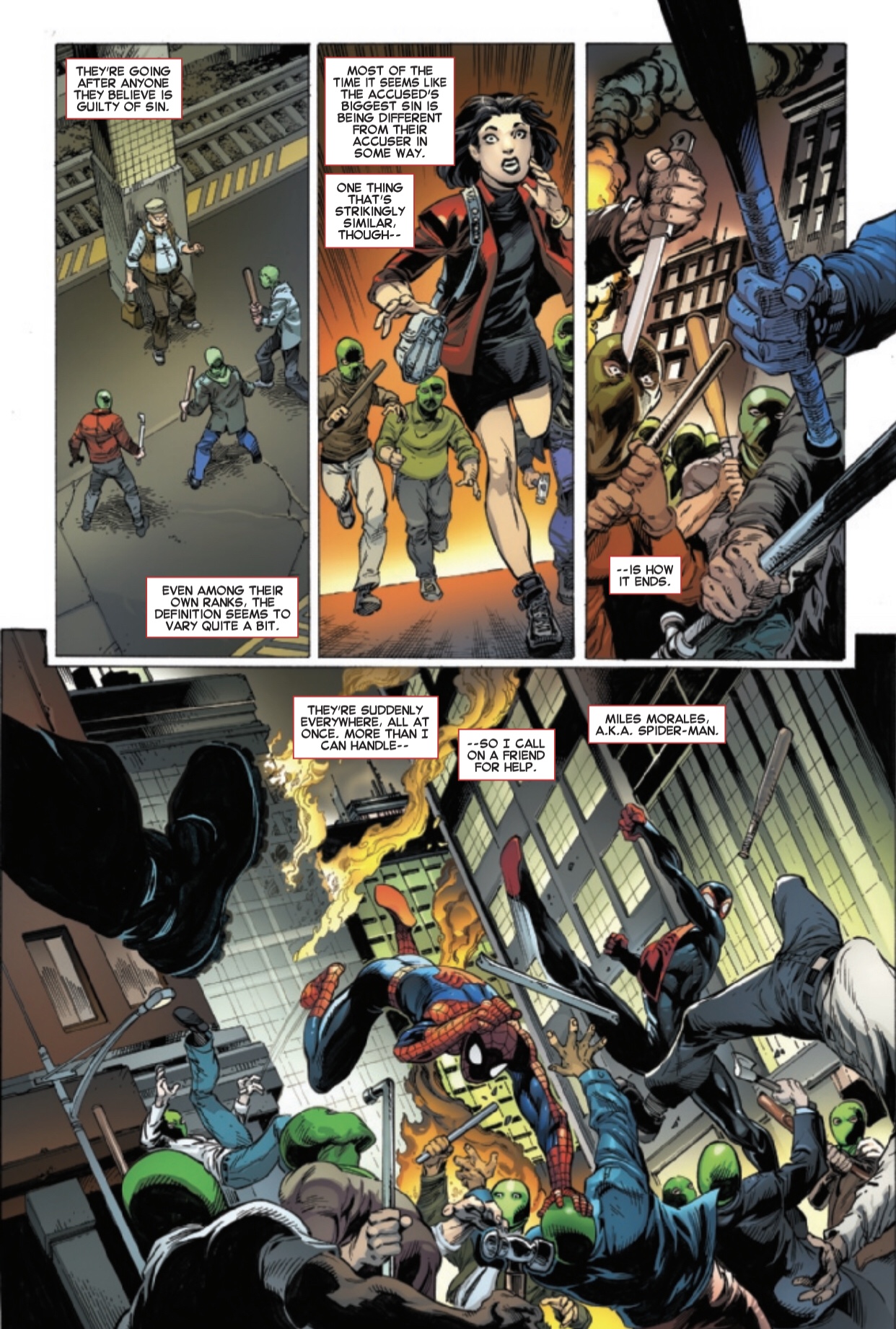 Anyway the art is on point. Mark Bagley has always been such a natural fit for Spider-Man after years of being a go-to on the character it probably needs no saying that everything looks great in this issue. We have a chance to see Bagley take his style to multiple Spider-Men and woman as the whole gang’s here. I’ll get into it more in the next paragraph, but almost every major and minor Spiderling shows up to have their respective conversations with Peter, but its not through a series of panels where these characters just stand around exchanging words. The art is not wasted on pages filled with floating heads spewing text bubbles everywhere. Bagley draws these characters fighting crowds of the Sin-Eater’s followers, so yes, there is action coming out of this word-heavy book. I really appreciate that even the landscape and backgrounds were given there dues. Here is an artist that made sure we aren’t looking at panels where characters exist in empty spaces. When you stop and notice what’s going on around the action, you see the work put into the skyscrappers in the background, the details in the subway station. Very few panels resort to the empty-bright action backdrop.