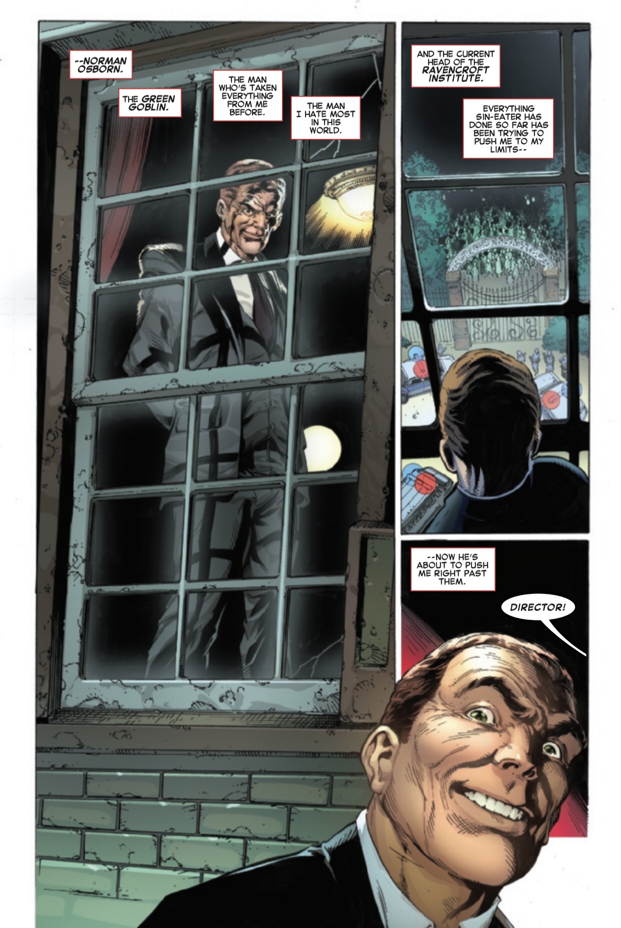 And the story itself continues the conflict of Sin-Eater gaining in power. Last issue dealt with Spider-Man having to consider the possibility that he may be the only person who believes what the Sin-Eater is doing is wrong, and also that maybe always assuming the best on people in general will always leave him sorely disappointed. Sometimes people are just mean and hateful, and will take any excuse to justify bringing out that hate. This issue kind of continues Peter seeking validation, this time by calling up his Spider-allies; Miles Morales, Spider-Gwen…Ghost-Spider, or Earth-65’s Spider-Woman (dealers choice on the name), Jessica Drew, Silk, Arana, and even Julia Carpenter. The current situation as it stands is the Sin-Eater and his hate-filled army of lemmings are storming Ravencroft, with Norman Osborn in their sights. So far, anyone who has fallen victim to the Sin-Eater has not died, but is instead reformed into a far less evil version of themselves. Spider-Man, Peter, wants to know that defending Norman from the Sin-Eater is the right thing, even though Osborn is the man Peter hates the most in the world. He just wants to hear it from the mouths of those who have their own respective connections to Norman in one way or another. Its amazing how this issue feels like it should read like a bit of a lull, the calm before the storm (the next issue looks like it’ll be renumbered as the big 850th issue so I expect it to be bonkers) but despite that, this issue did not feel any less exciting or interesting than the last few. All in all, this has been a consistently good arc.
