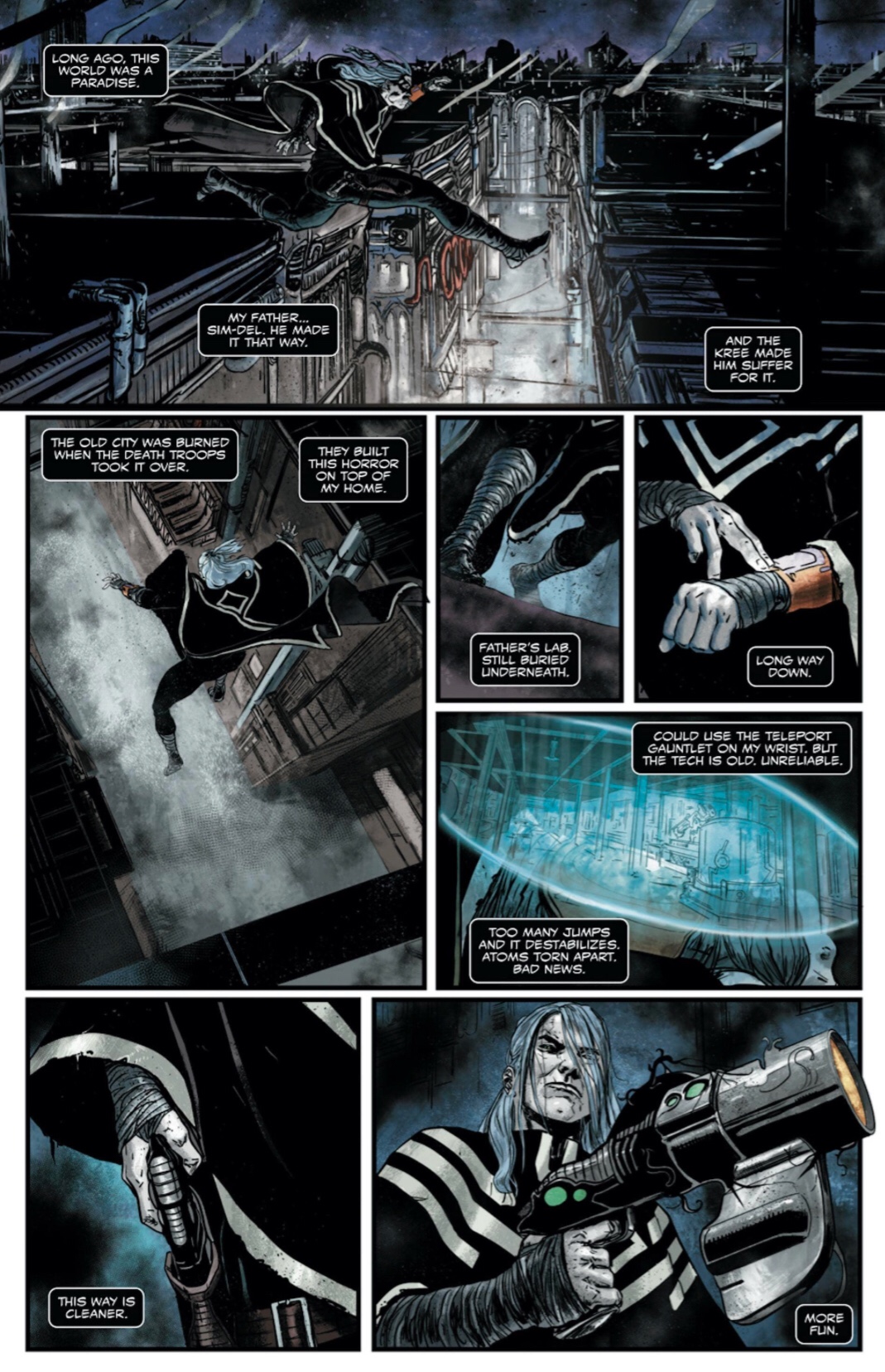 Now, let me say that I consider myself to be a legit Venom aficionado. I can tell you more about Venom and all peripheral lore surrounding the characters than I should have any right to. So I always come into any Venom story so sure I’ll be right in my element. That said, I came into this book having absolutely no clue of Wraith, or his origins, or his powers, his motivations, what his beef is, or even if this is a hero or an antagonist. Here I was, handed a copy of a Venom book that stared back at me, and I felt…so unsure. And it was exciting. I felt this fun anxious need to crack this book open and hope for the best…