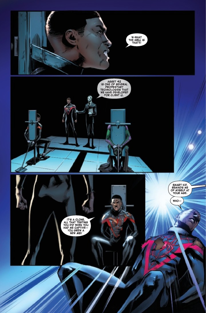 No one knows the full consequences when worlds collide: Are there aftershocks, echoes, doubles? Miles is already battling a man who shares his name. What does it mean when he finds someone with his face in his family living room? Was this clone made or born? And which Miles will survive this saga?