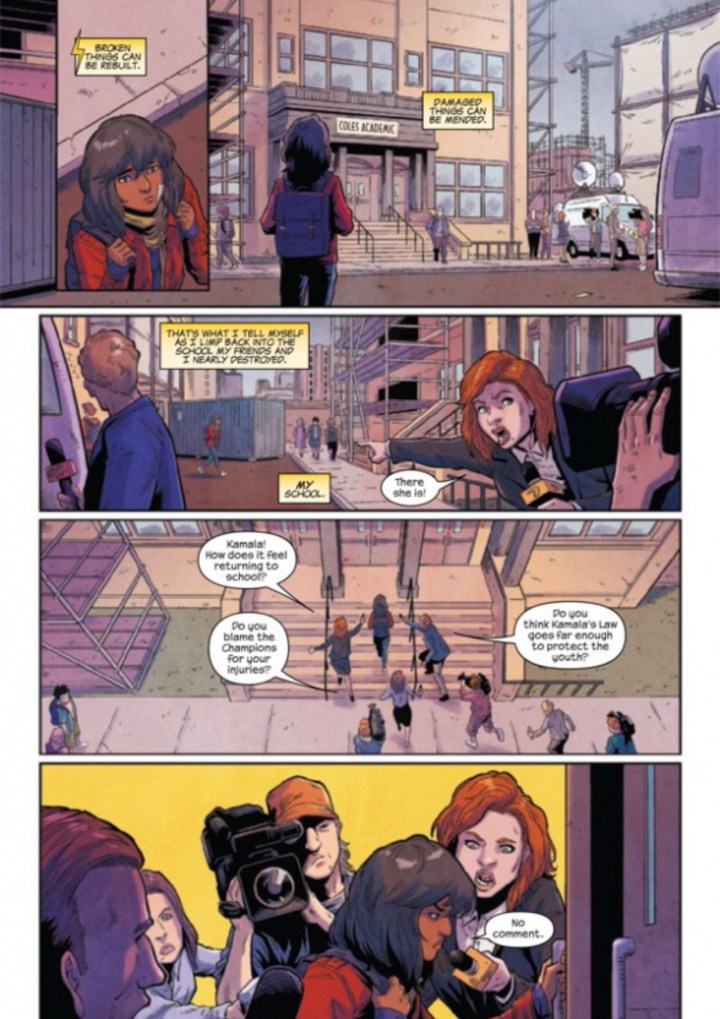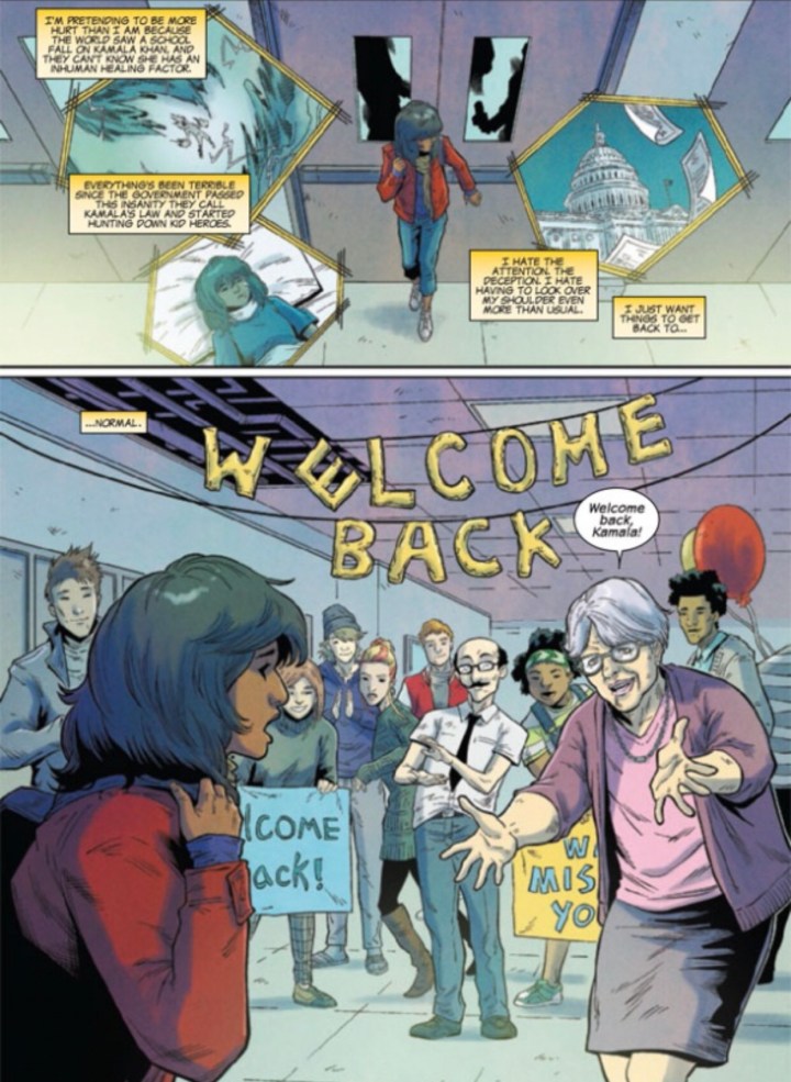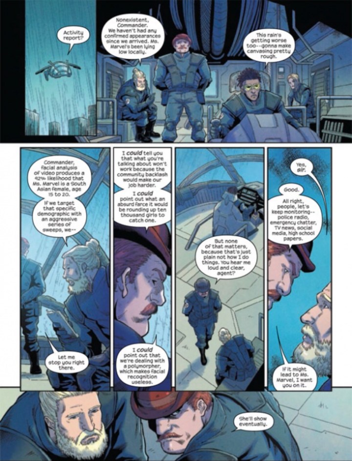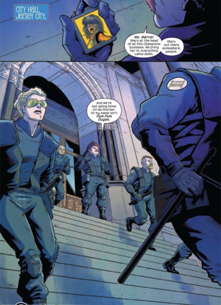 The anti-teen-hero task force, C.R.A.D.L.E., is scouring Jersey City to apprehend its young protector, Ms. Marvel. But C.R.A.D.L.E. isn’t the only problem on Kamala’s plate – several of her family members support the new law, and if they discover her secret identity, it’s game over for Ms. Marvel.