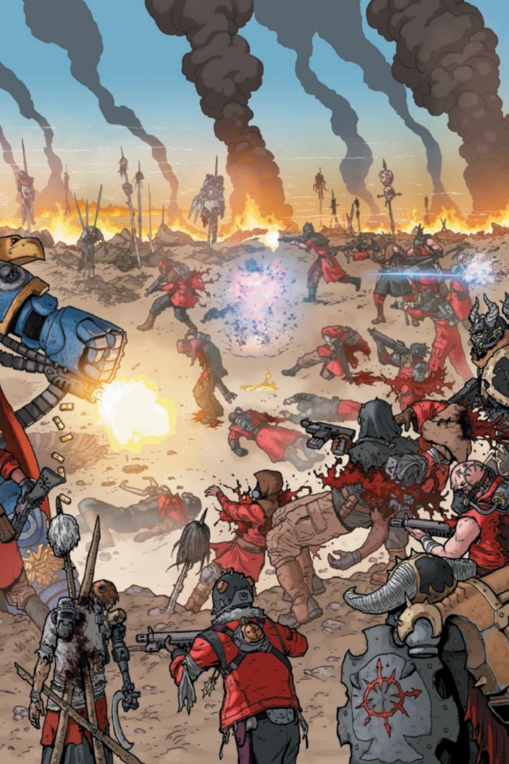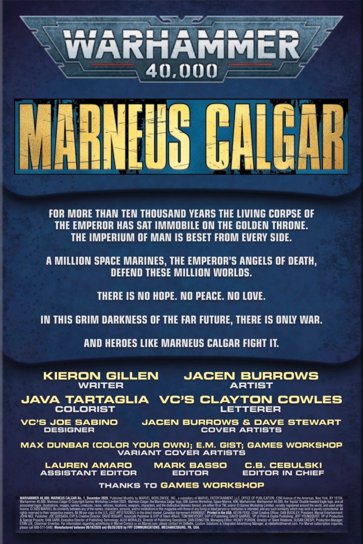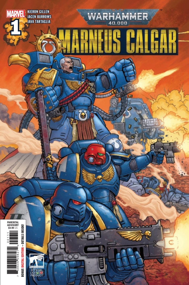 In the grim darkness of the far future there is only war… The saga of WARHAMMER 40,000 comes to Marvel Comics! MARNEUS CALGAR, the legendary Chapter Master of the Ultramarines, leads his elite Space Marines against humanity’s greatest threats in a galaxy engulfed in endless war. Kieron Gillen (UNCANNY X-MEN, JOURNEY INTO MYSTERY, The Wicked + The Divine) spearheads the initiative with this introductory miniseries, illustrated by Jacen Burrows (PUNISHER: SOVIET, MOON KNIGHT, Crossed)–and we’re just getting started!