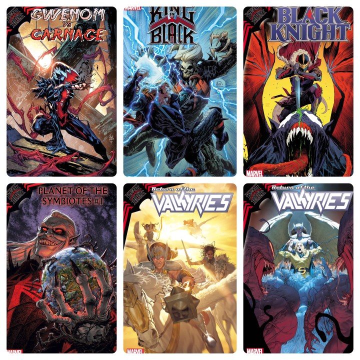 KING IN BLACK: PLANET OF THE SYMBIOTES will collect essential King in Black stories by creators like Clay McLeod Chapman, Guiu Vilanova, Frank Tieri, and Danilo Beyruth, featuring the return of Scream and a visit to the Ravencroft Institute. Jane Foster reunites the Valkyries to take on Knull’s army in KING IN BLACK: RETURN OF THE VALKYRIES by Jason Aaron, Torunn Grønbekk, and Nina Vakueva. It’s a symbiote showdown like you’ve never witnessed before in KING IN BLACK: GWENOM VS CARNAGE by Seanan McGuire and Flaviano. The Black Knight wields the Ebony Blade once more to take down Knull in KING IN BLACK: BLACK KNIGHT by Simon Spurrier and Jesus Saiz. And Kingpin assembles a squad of villains to save the city in KING IN BLACK: THUNDERBOLTS by Matthew Rosenberg and Juan Ferreyra.