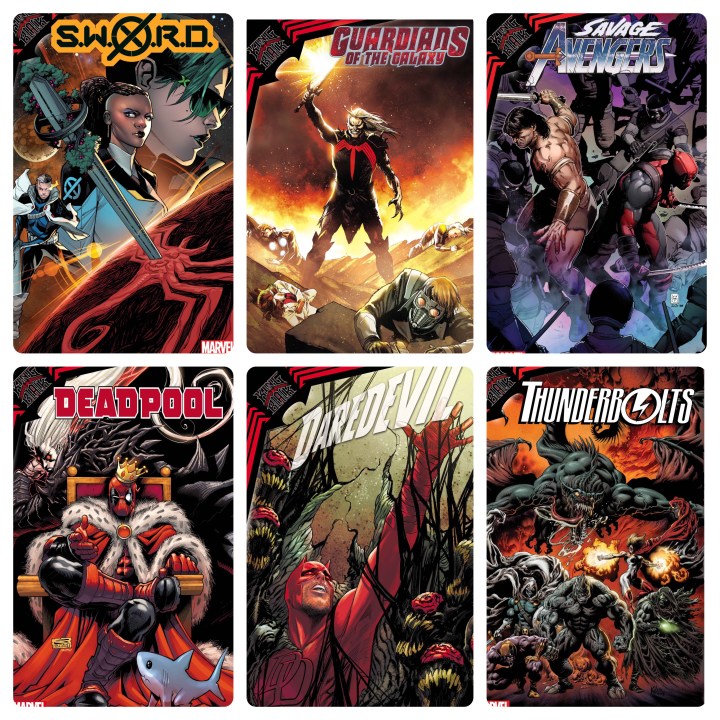 Knull’s invasion will also be felt in tie-ins to some of your favorite ongoing and upcoming titles like DAREDEVIL #26 by Chip Zdarsky, Marco Checchetto, and Mike Hawthorne, DEADPOOL #10 by Kelly Thompson and Gerardo Sandoval, GUARDIANS OF THE GALAXY #10 by Al Ewing and Juann Cabal, SAVAGE AVENGERS #17 by Gerry Duggan and Kev Walker, and S.W.O.R.D. #2 by Al Ewing and Valerio Schiti.