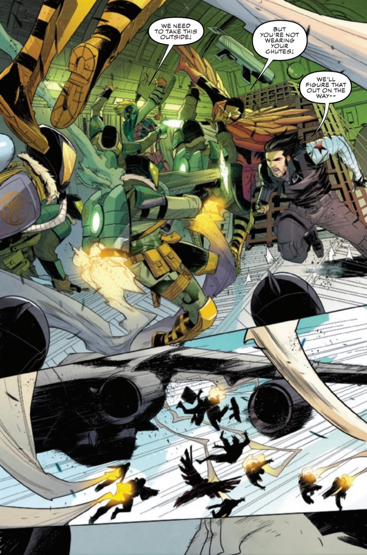 With the Natural by their side, Sam Wilson and Bucky Barnes travel to confront the woman who is scheming to become the new Hydra Supreme. Nothing seems to go right for our boys, however, as the plane they’re about to jump out of is beset by a swarm of Hydra agents. On jetpacks. Shooting laser beams.