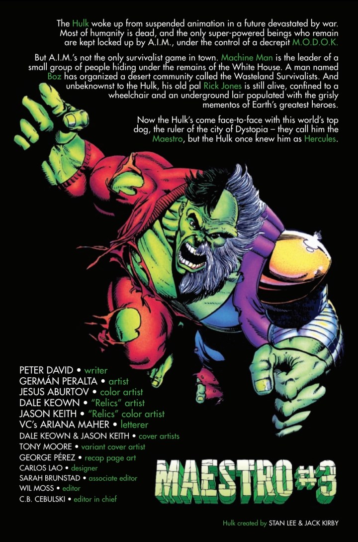 The Hulk meets the Maestro-and it’s not who you expect it to be. And when a band of rebels tries to recruit the Hulk to fight beside them, his answer sends shock waves through Dystopia. This world will never be the same…and neither will the Hulk.