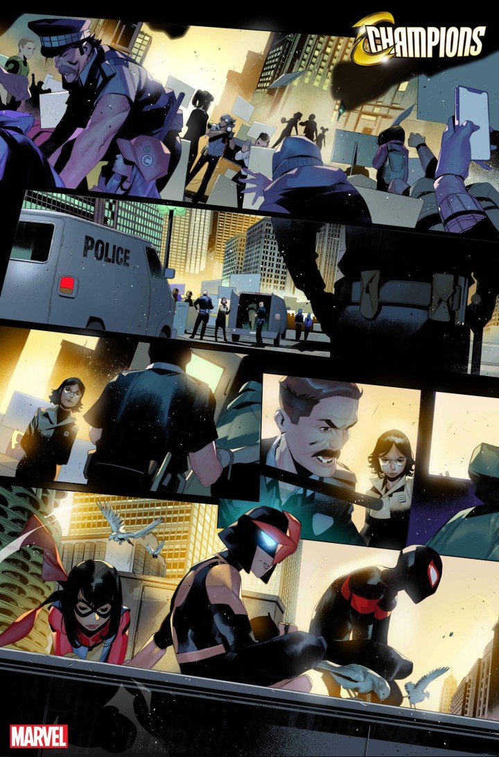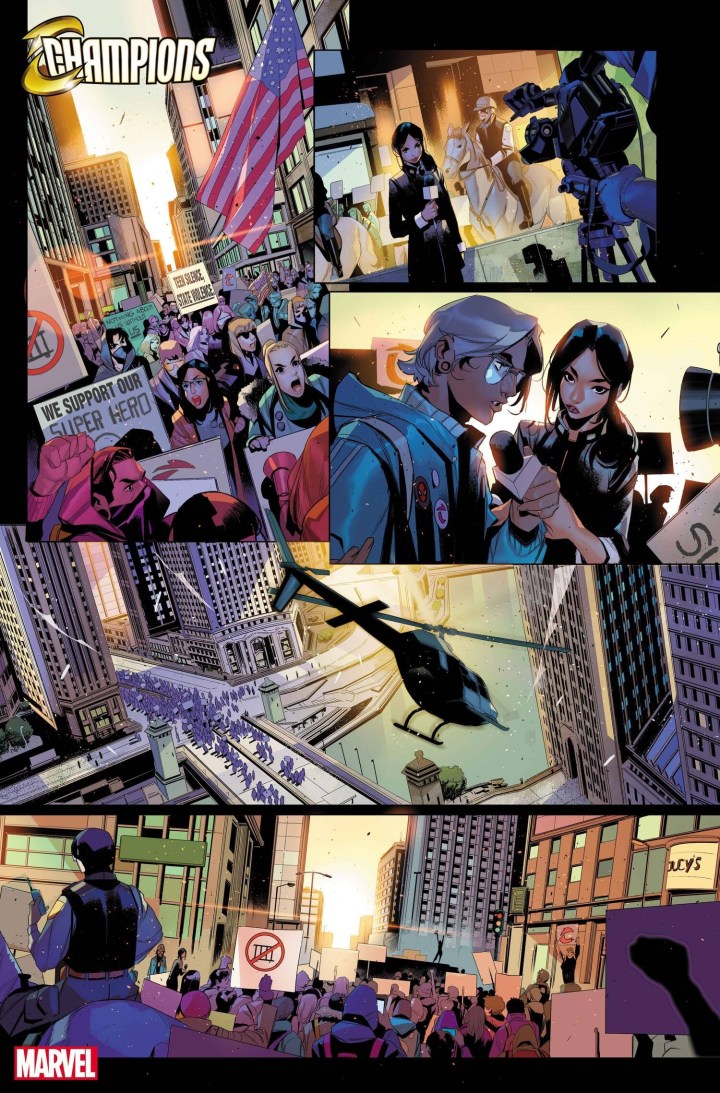 When clashing protests over the teen vigilante ban break out across Chicago, the Champions risk their freedom to protect the young protestors from overzealous C.R.A.D.L.E. agents – but Chicago’s own hometown hero, Ironheart, is nowhere to be seen. Where is Riri Williams? Why has she abandoned the Champions? And could it have anything to do with the mole in their ranks…?
