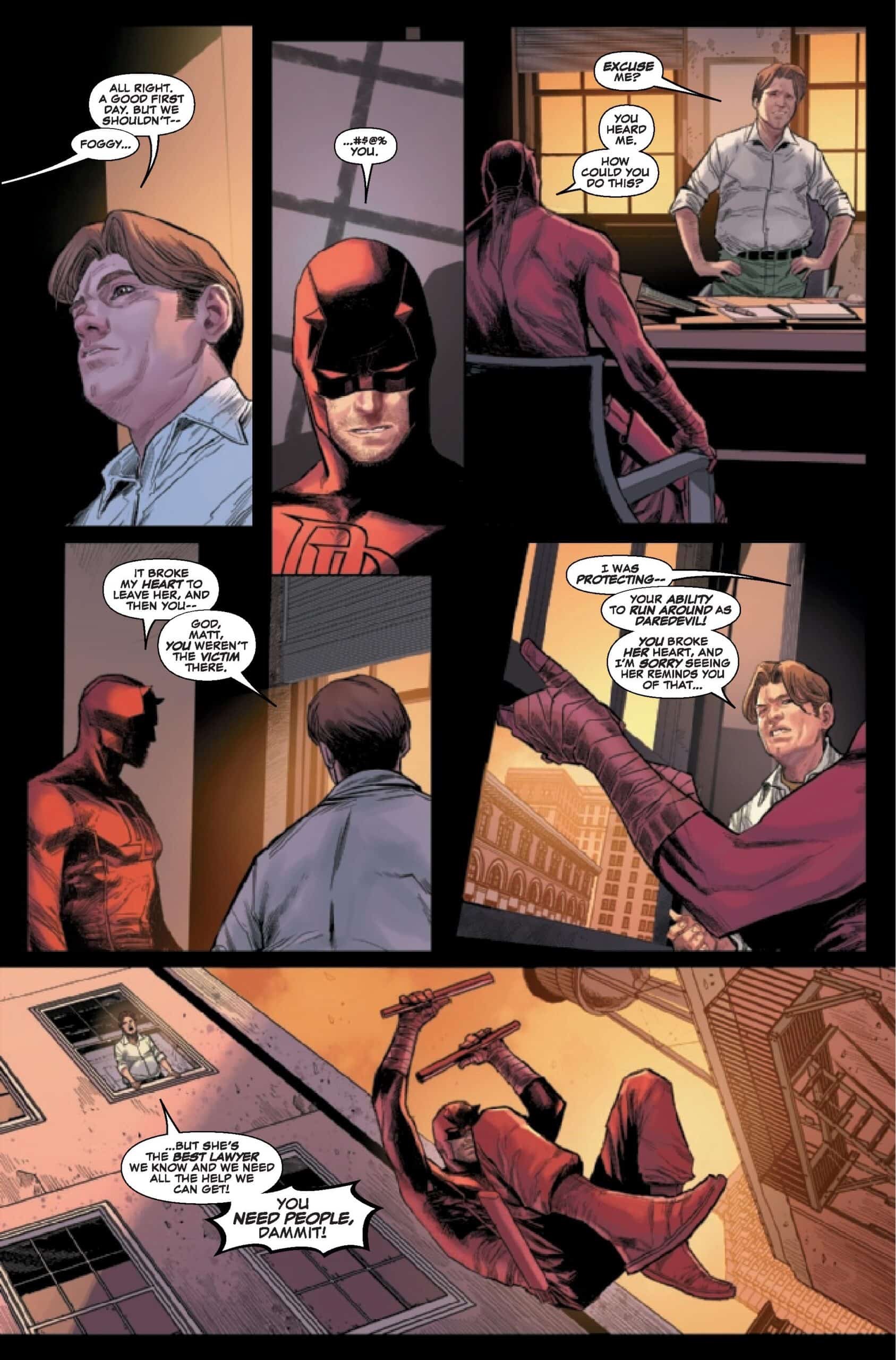 In a book full of surprises, the last issue’s cliffhanger was significant in a more subtle way. Matt’s old love, Kirsten McDuffie, showed up to help with Daredevil’s murder trial, and it ties in so well with what’s going on in this book. The issue opens up with a bit of an explanation for unfamiliar readers and continues through the issue. At a time when Matt is at his lowest and feeling guilty enough for what he’s done, Foggy throws yet another thing Matt hates about himself into the fold. He is so pissed, but Foggy throws it right back at him. It does an excellent job of showing us that this isn’t going to be a cakewalk trial, and Foggy is worried that his friend will be going to jail.
