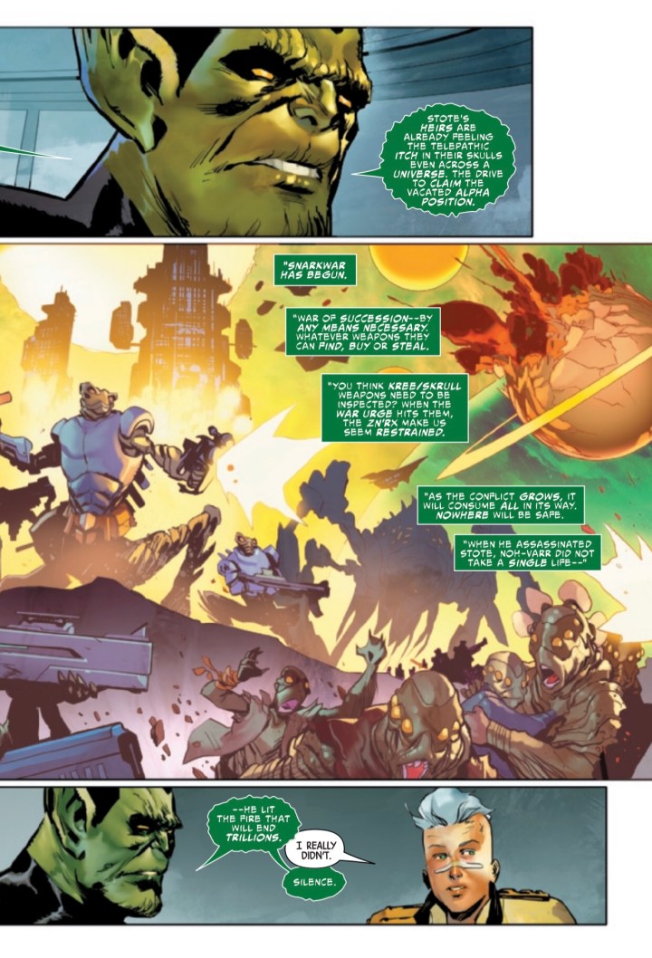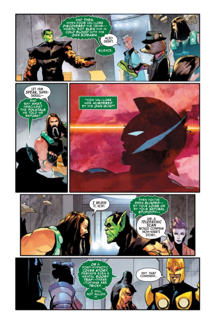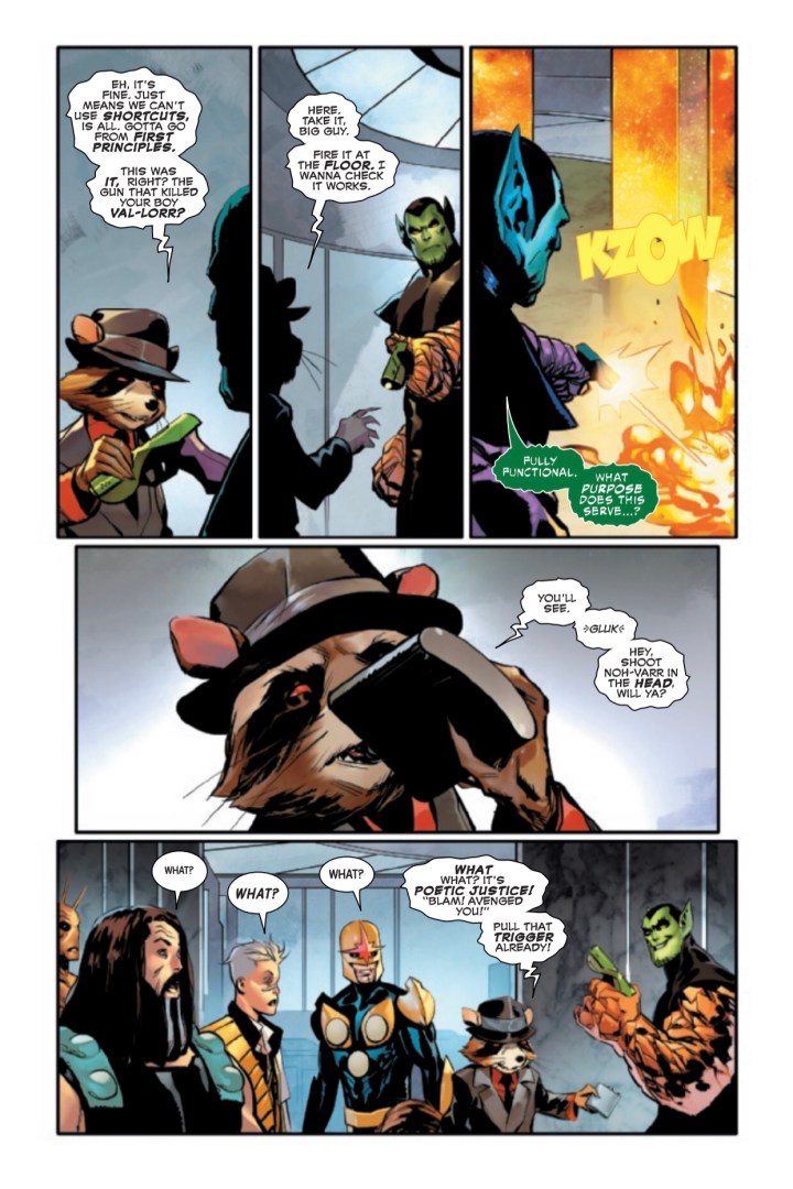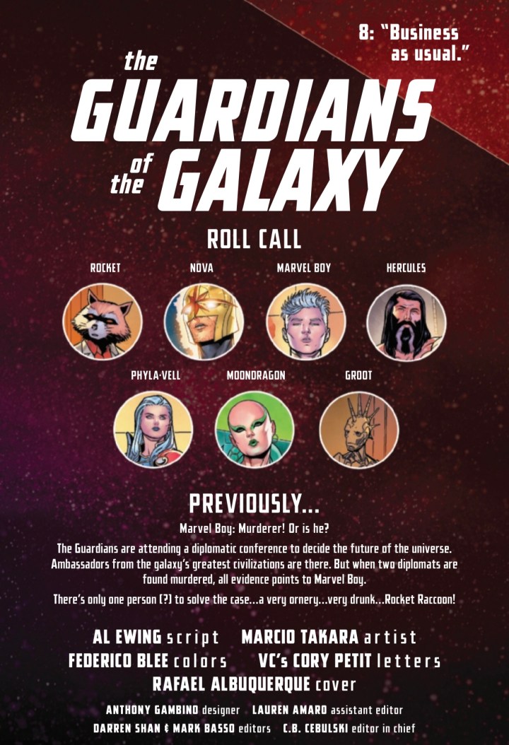 At the diplomatic conference to decide the future of space, there’s been a murder most foul – and one of the delegates is responsible!It’s up to Ranger Rocket to save Marvel Boy from execution, solve the mystery and find the real killer – while a ticking bomb counts down to zero! Can things get worse? It’s GUARDIANS. Things always get worse.