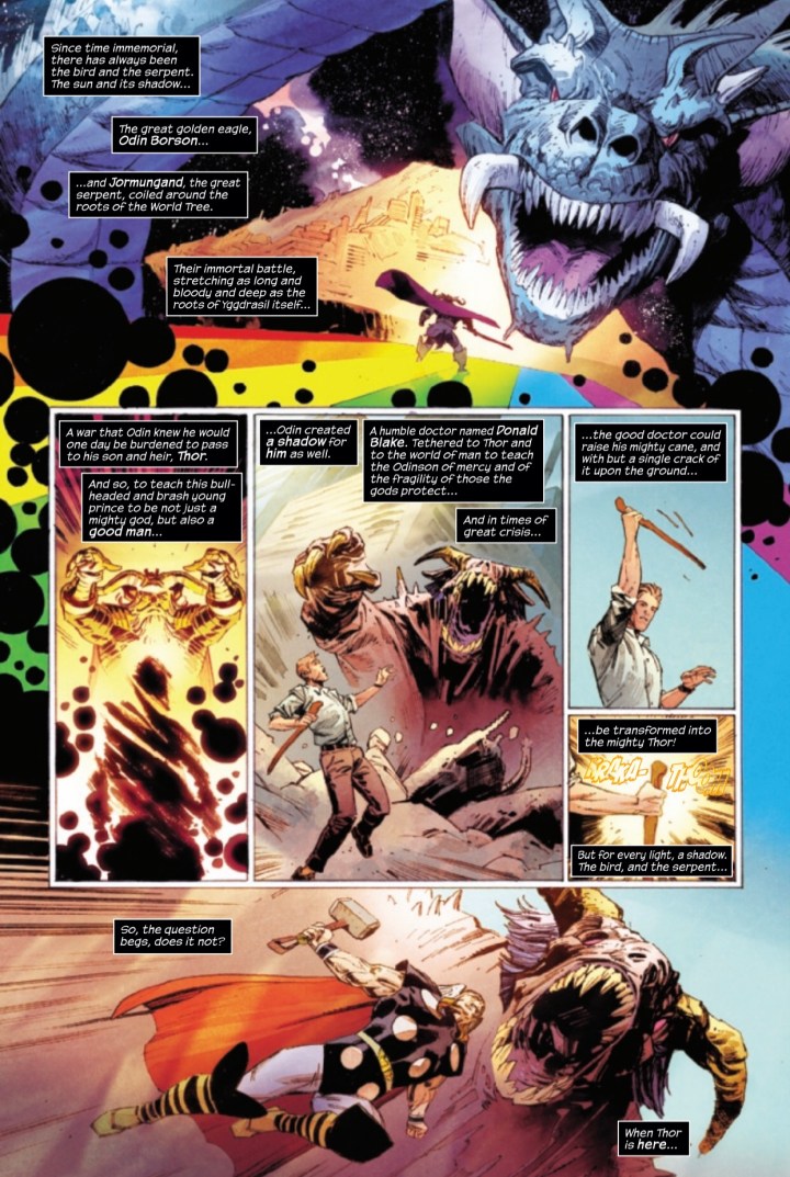 The “Prey” arc starts here! Once upon a time, a mortal man bore within him the spirit of a god. With a crack of his cane upon the ground, the Mighty Thor would appear! But it’s been years since the King of Asgard required his human ward. Where has the good doctor been all this time – and what does his reappearance mean for the God of Thunder? Donny Cates and Nic Klein journey into a mystery left unsolved since 1962!