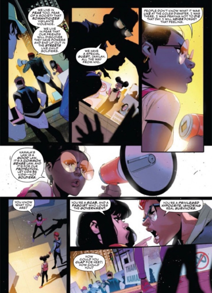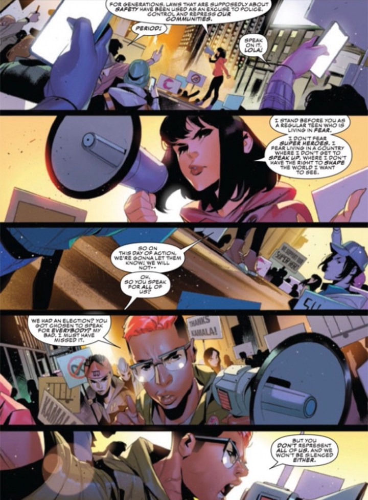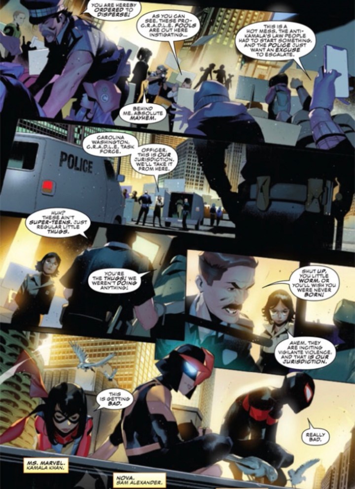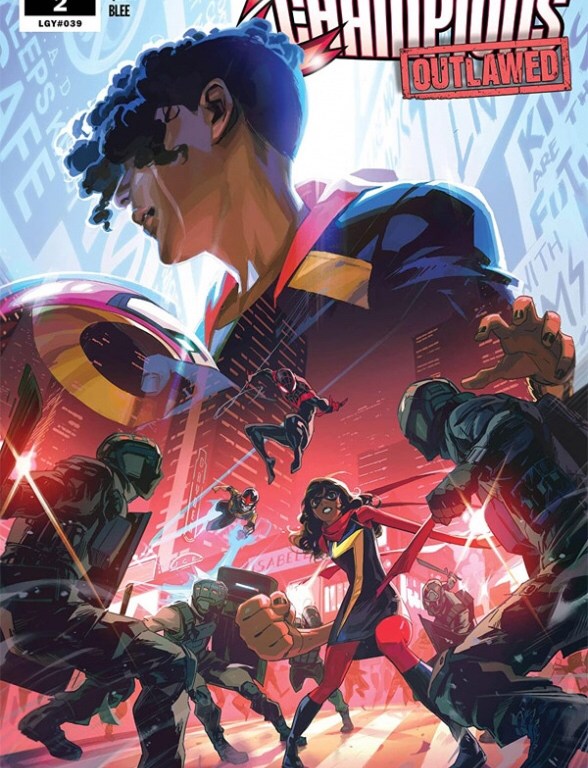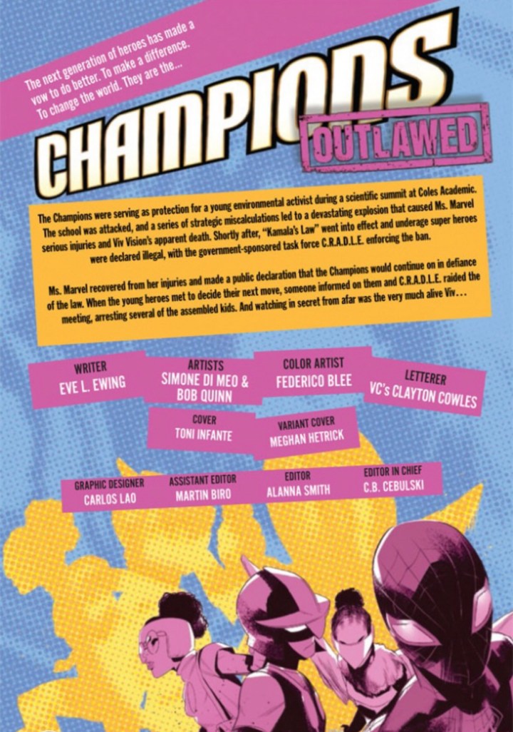 When clashing protests over the teen vigilante ban break out across Chicago, the Champions risk their freedom to protect the young protestors from overzealous C.R.A.D.L.E. agents – but Chicago’s own hometown hero, Ironheart, is nowhere to be seen. Where is Riri Williams? Why has she abandoned the Champions? And could it have anything to do with the mole in their ranks…?