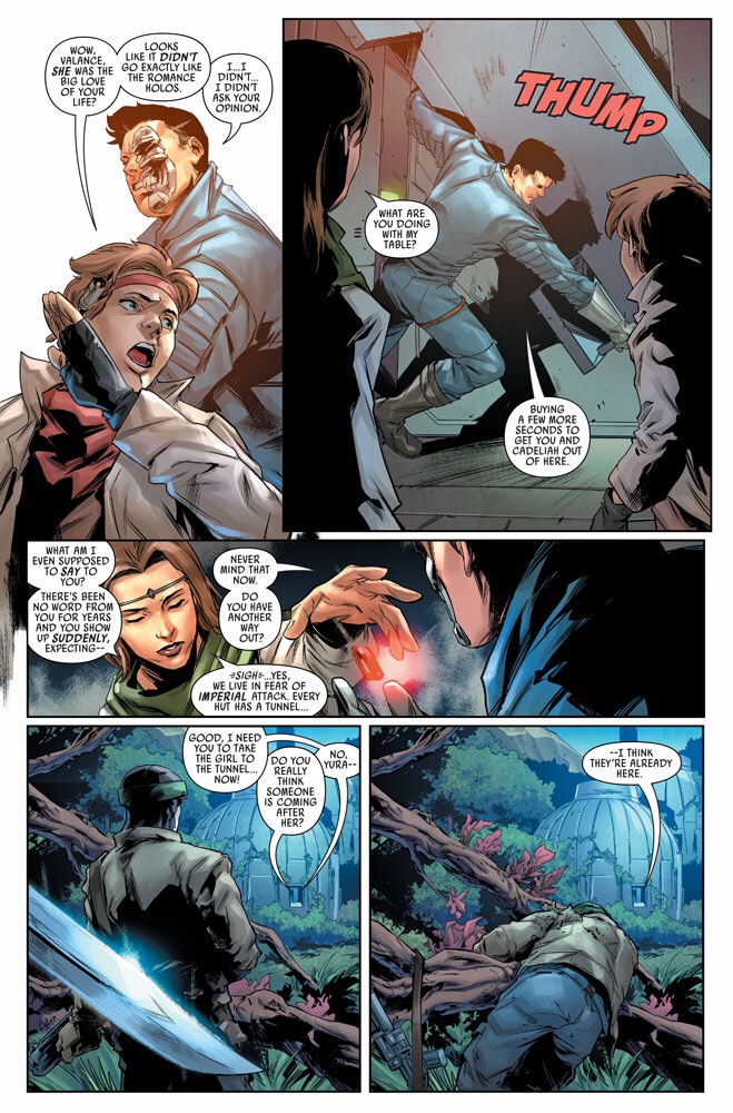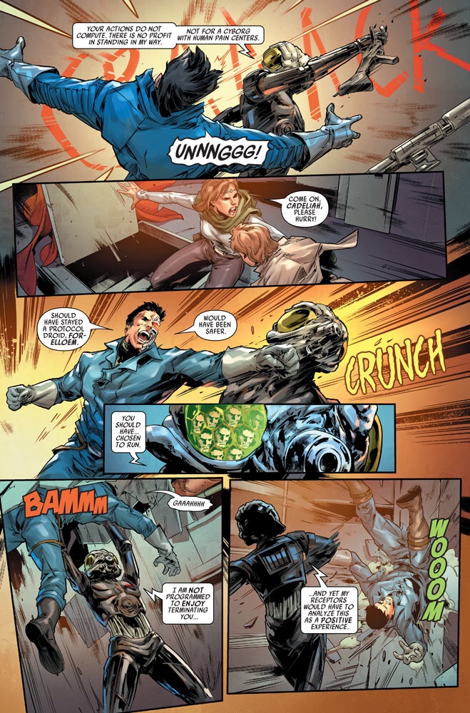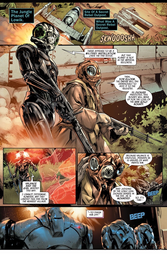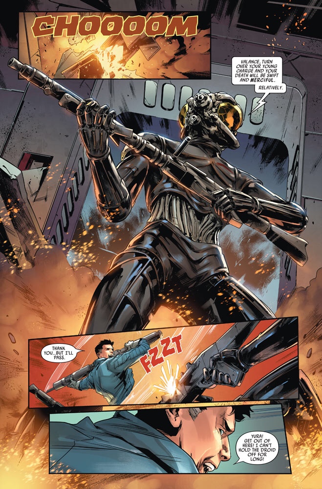 A badly wounded VALANCE reunites with a long lost love on a secret Rebel base… but trouble is right on his heels. ZUCKUSS AND 4-LOM, the deadliest bounty hunting duo in the galaxy are closing in, ready to take out their quarry dead or alive! And they brought an army of Clone War-era Battle Droids with them! Valance is trapped and if he wants to escape alive he’ll have to make the toughest decision of his entire life.