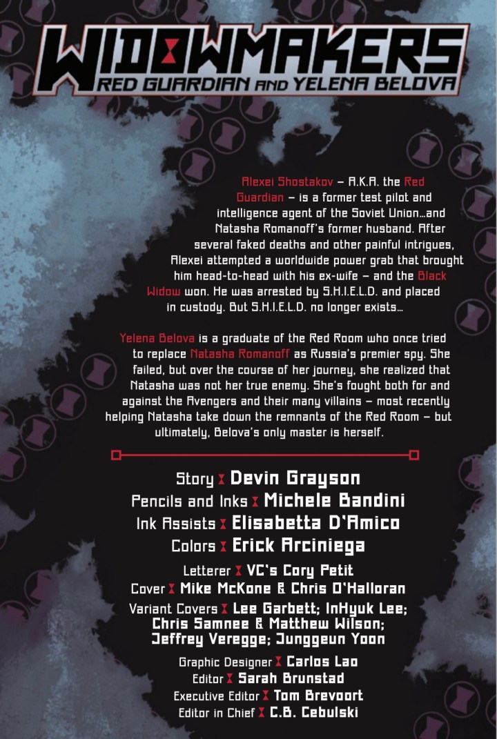 Devin Grayson, one of the creators of Yelena Belova – the Red Room recruit who once nearly killed Natasha Romanoff – returns with a brand-new story drawn by rising star Michele Bandini! Yelena has spent years trying to figure out who she is. Once she thought the Black Widow mantle was her destiny, but fate had other plans. Now the past is catching up with her – and with Alexi Shostakov, a.k.a. the Red Guardian! Alexi has worn many titles, including husband to Natasha, but while the Widow played her avenging games, the Red Guardian waited in the shadows. Now a new day is dawning – and this time, no one will stand in his way.
