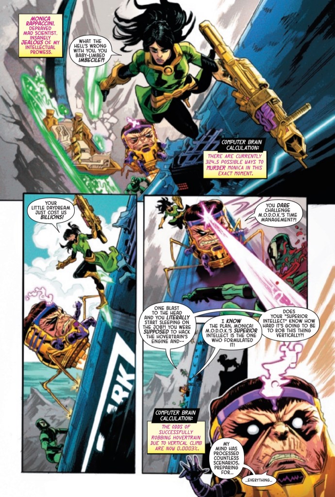 WAKE UP! A screaming Monica Rappaccini snaps M.O.D.O.K. out of his reverie. This happened to him in the middle of a heist. It is not good to show weakness if you’re a villain, especially with billions on the line. Even if it happens because you took a blast to the head like M.O.D.O.K. did. People will try to take advantage of any moment of hesitation or handicap in the villain game.