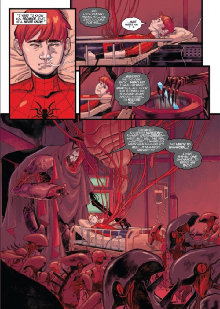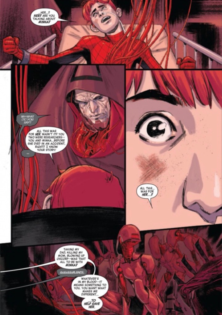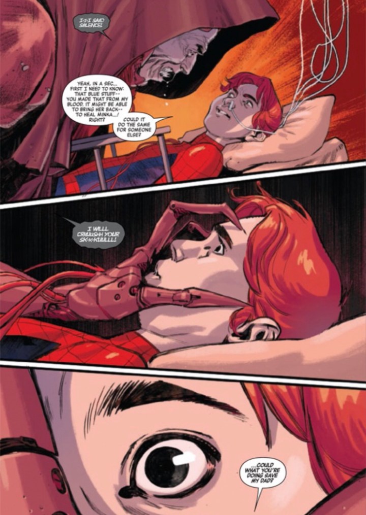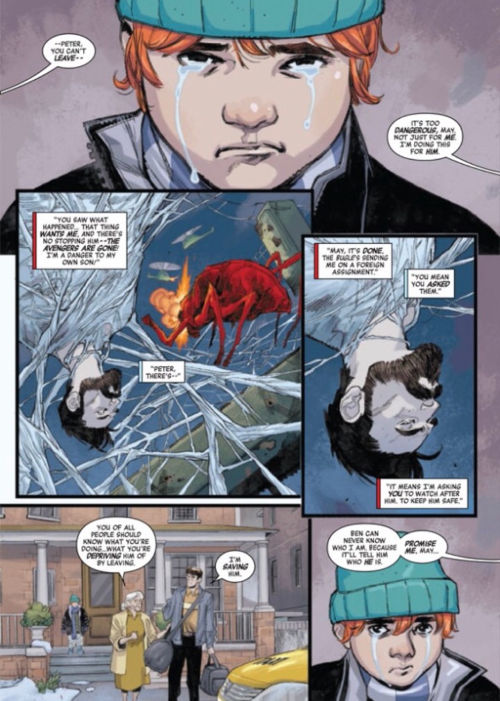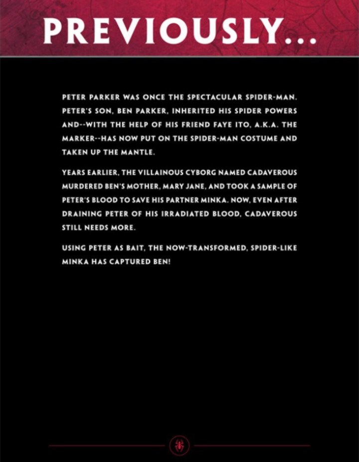 Ben Parker and his dad are cornered and surely beaten. Their allies that they thought could help them weren’t enough. The son of Mary Jane and Spider-Man has an unwinnable fight on his hands… have his absentee dad and dead mother taught him enough to know what Spider-Man does in these situations?