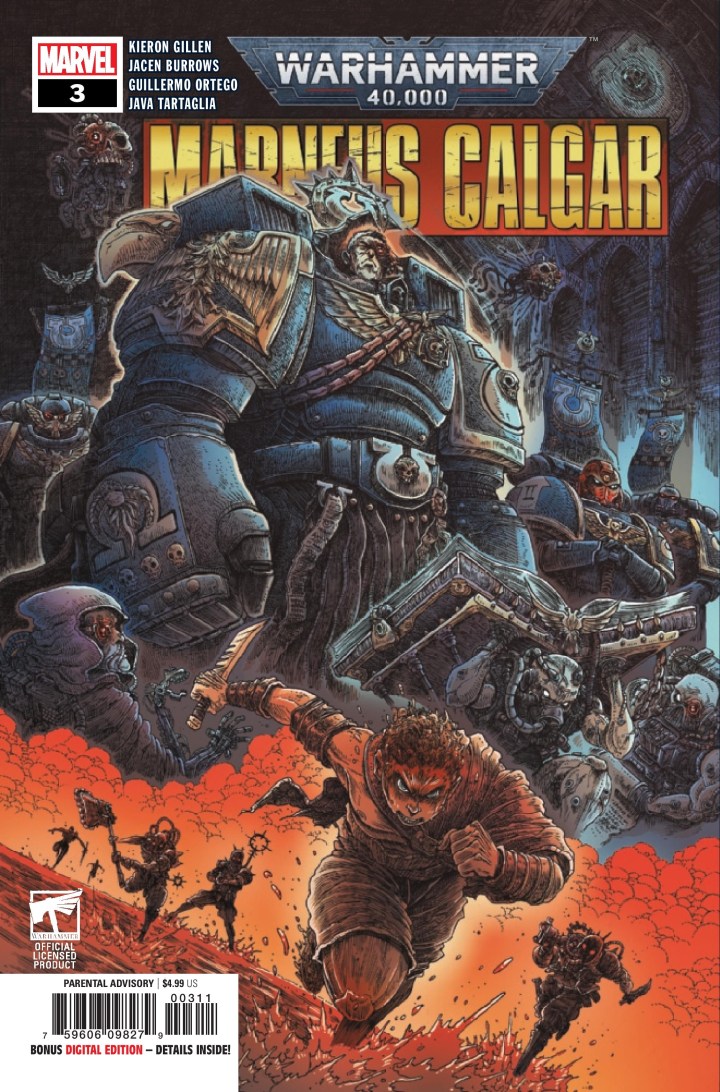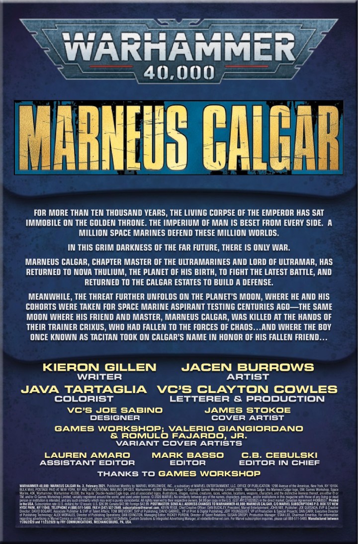 The young TACITAN takes drastic action as the secret hidden on Nova Thulium’s moon comes to light! In the 41st millennium, heretics invade the homeworld of MARNEUS CALGAR – and only he and his ULTRAMARINES can stop them! But will Calgar’s perilous battle plan save the Imperium or doom it to the corruption of chaos?