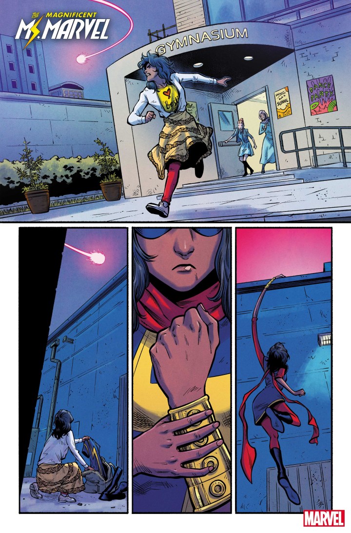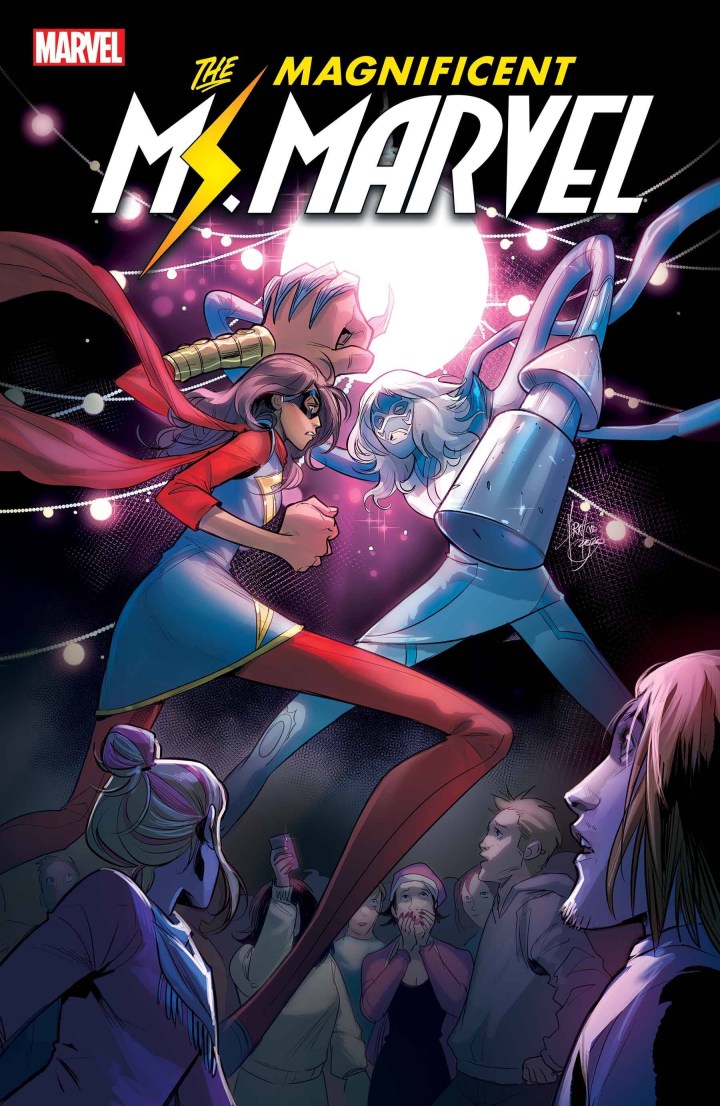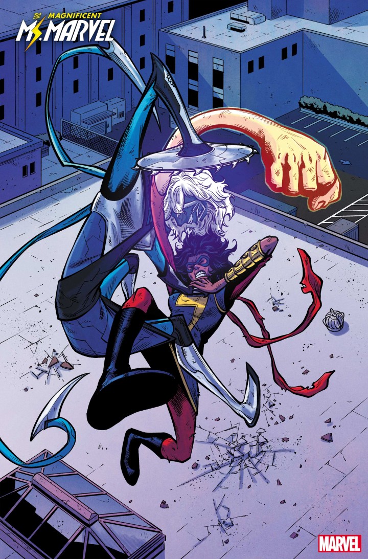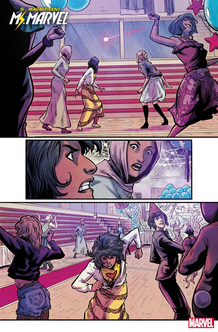 SALADIN AHMED and MINKYU JUNG wrap their acclaimed run with an oversized final issue! It’s the night of the Coles Academic homecoming dance and all of Kamala’s friend and family dramas are coming to a head. Even worse, this party has an uninvited guest: STORMRANGER is back and more lethal than ever! With AMULET’s help, MS. MARVEL defends everything that’s dear to her – but will her best be enough against such relentless enemy?