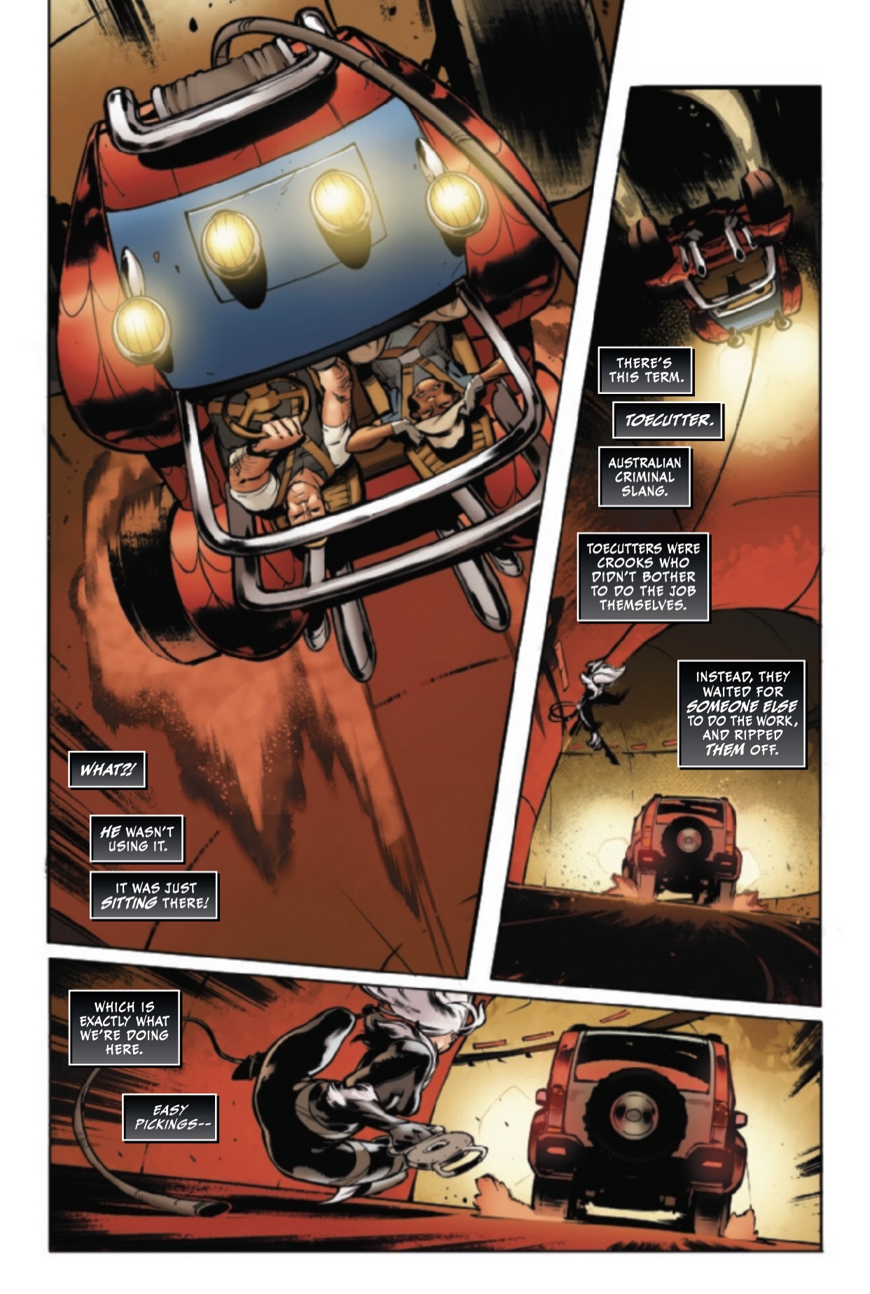 We open with an explanation of hidden cash reserves peppered throughout abandoned SHIELD locations. Thieves have been quietly raiding these reserves since SHIELD disbanded, and Black Cat, like any good master thief, has assumed the position of ‘toecutter’ by robbing the robbers as they make their getaways in underground tunnels.