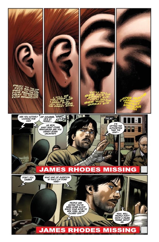 The first mistake Cantwell makes is starting the issue off with a missing James Rhodes. How did that even happen? The world may never know, because it was simply put into the story to motivate Tony into looking for Korvac. Because of course this seemingly brain dead, numb Tony Stark Cantwell has created needs more of a reason to find the person that just mopped the floor with him and Patsy last issue.