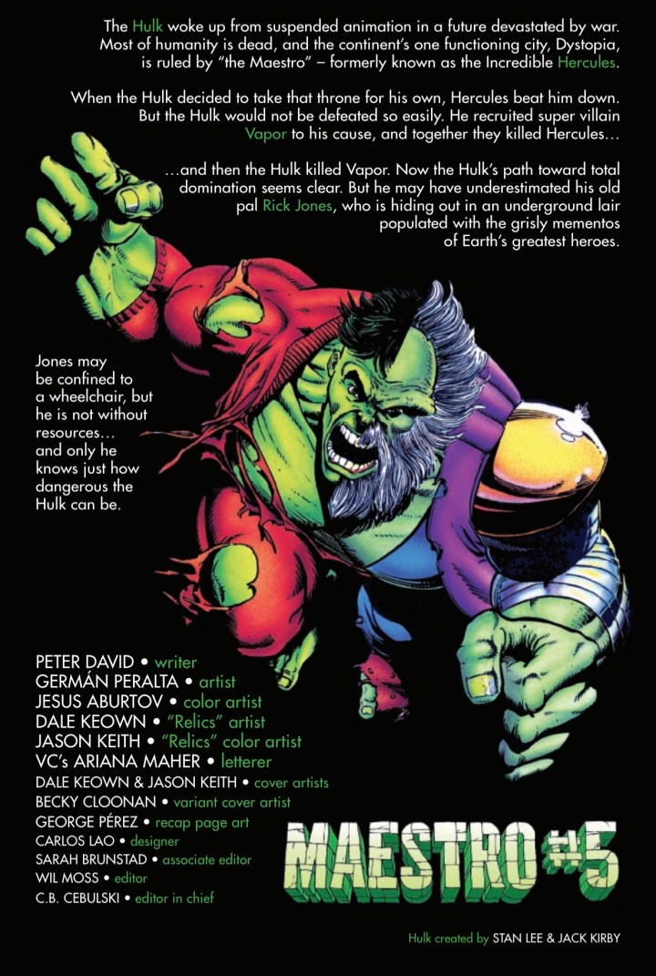 The Hulk is dead – long live the Maestro! But this is no good night lullaby. It’s nonstop action in Peter David fashion as the secrets behind Future Imperfect finally come to light!