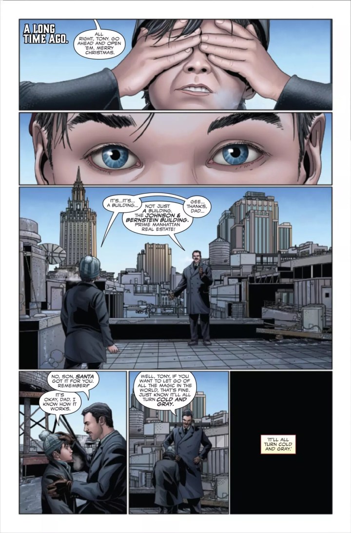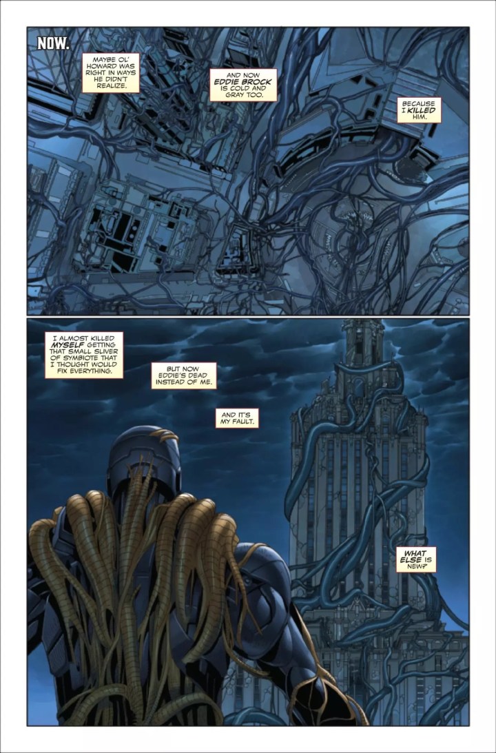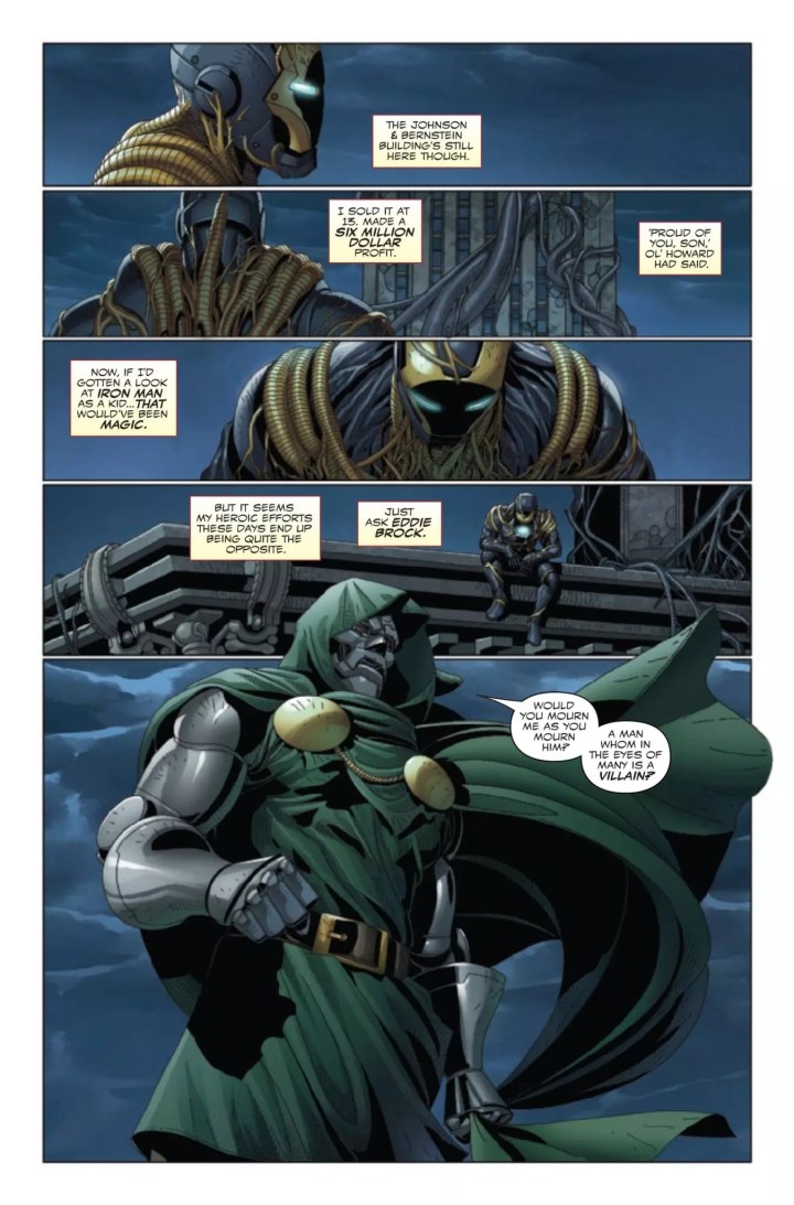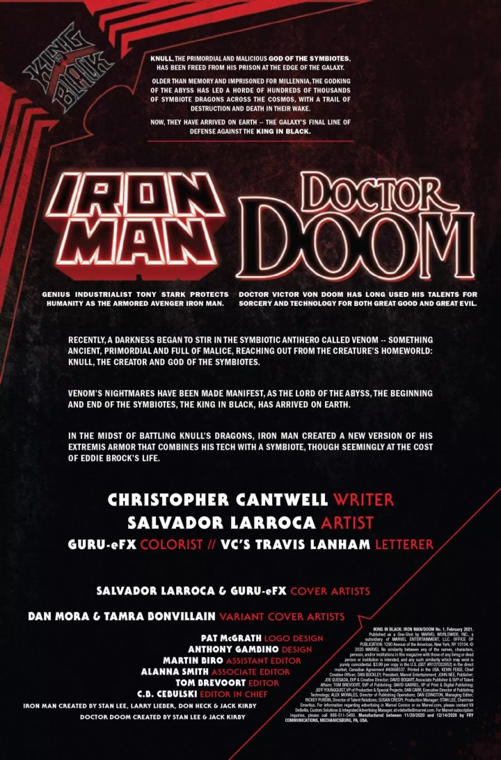 Iron Man has risked everything to save Eddie Brock, but now he’s left with nothing but guilt. As longtime ‘frenemy’ Doctor Doom shows up with both counseling words and ulterior motives, they’lll be forced to battle an all-too-familiar specter of the holiday season-albeit one now twisted and controlled by the recent invasion of Earth by the symbiote homeworld. As Iron Man and Doom fight as temporary allies, their unexpected encounter both with each other and a horrifying inversion of yuletide joy may ultimately reveal to them the true meaning of Knull-mas.