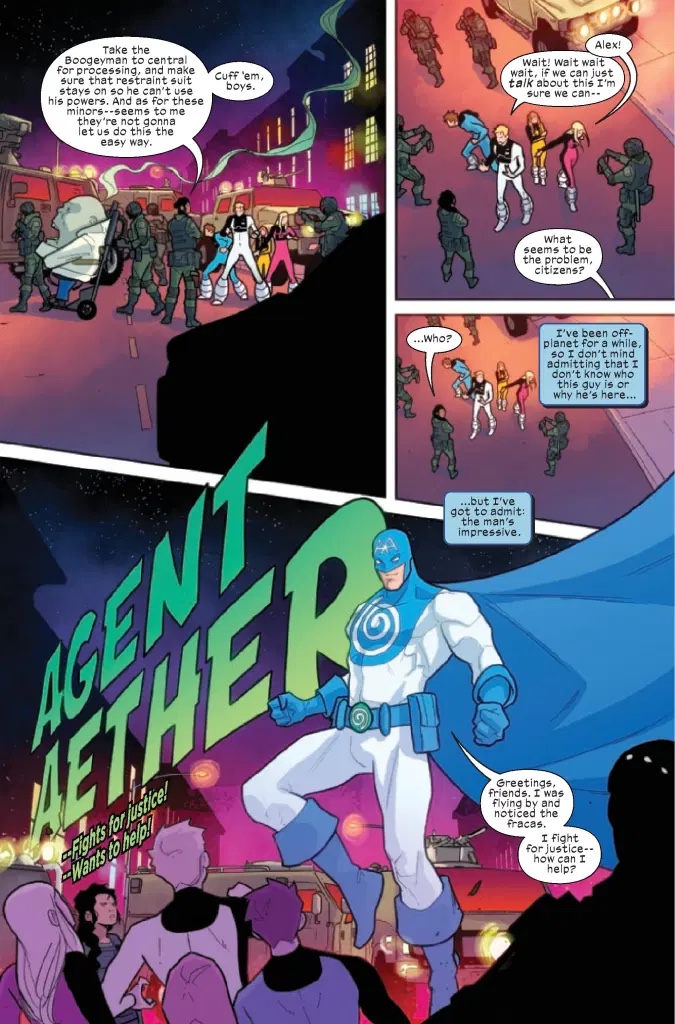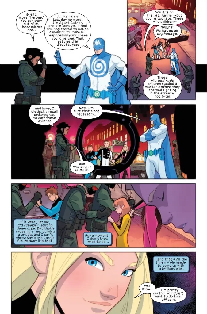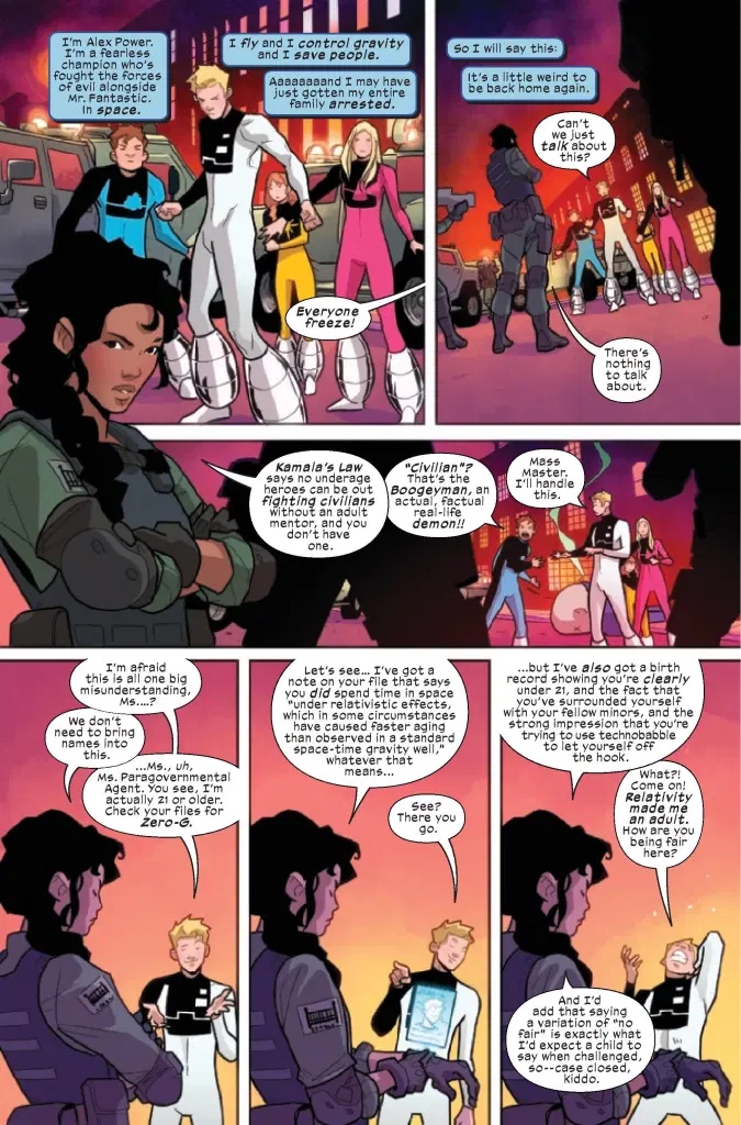 Okay, so MAYBE it’s illegal for minors to fight crime in costume, dispensing vigilante justice as they see fit. MAYBE. But not if they have a mentor! Then it’s totally fine! So now all the Pack need is an adult willing to let them do whatever they want. It’s a voyage (or at least a two-page spread) across the Marvel Universe to find a mentor! But what if everything doesn’t go smoothly? What if there’s CONFLICT and EVENTS? The Power Pack faces adversity, betrayal and more in this Alex-narrated issue!