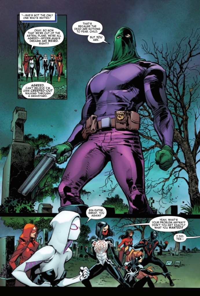 The previous point LR issue was one I really wasn’t a fan of. As these side issues accompanying the Spider-Man/Kindred story started to ware on, these Spider-Friends and Sin-Eater plots started to feel less connected to the bigger (and frankly better) main story that was going on. Two point LR issues ago and I was starting to feel like these were just the leftovers of the “Sins Risings” arc that preceded our Last Remains story, and just one point LR issue ago I began to wonder if any of this would come back around to the main story.